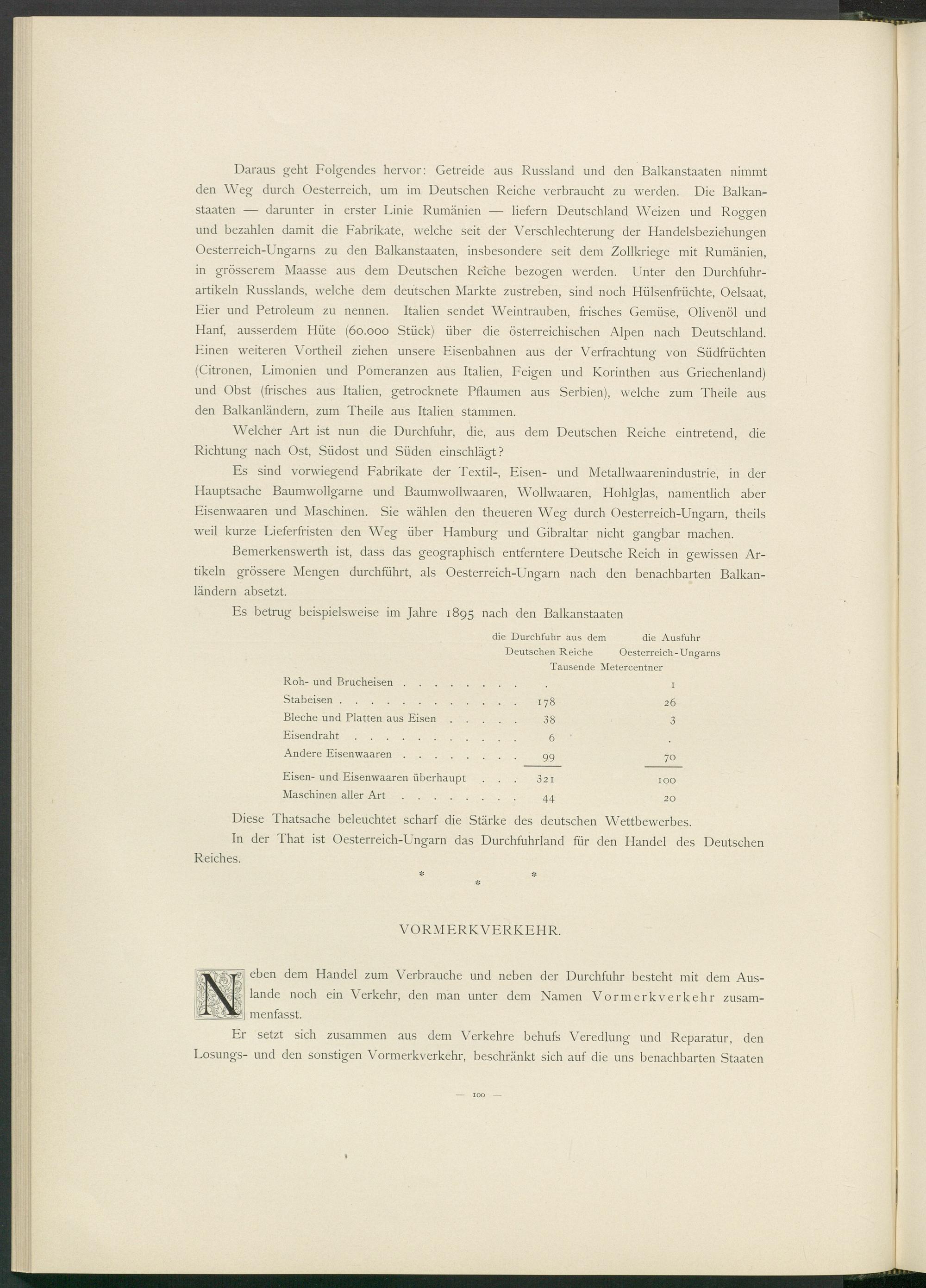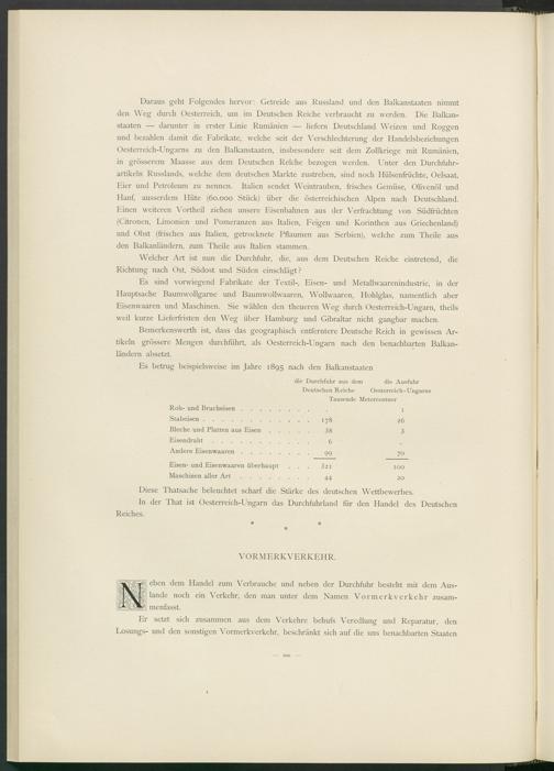 Bemerkenswerth ist, dass das geographisch entferntere Deutsche Reich in gewissen Artikeln grössere Mengen durchführt, als Oesterreich-Ungarn nach den benachbarten Balkanländern absetzt.