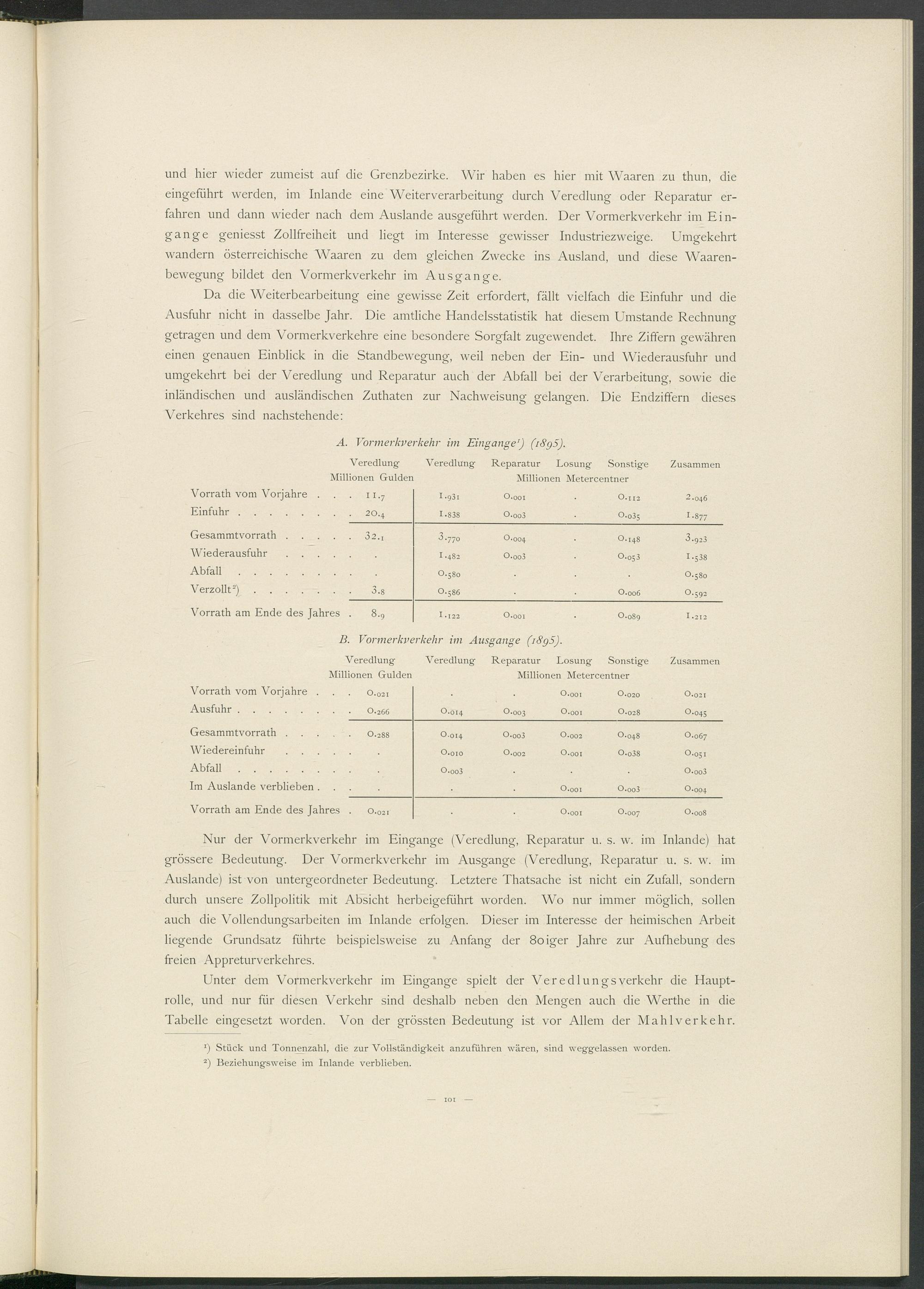 Da die Weiterbearbeitung eine gewisse Zeit erfordert, fällt vielfach die Einfuhr und die Ausfuhr nicht in dasselbe Jahr. Die amtliche Handelsstatistik hat diesem Umstande Rechnung getragen und dem Vormerkverkehre eine besondere Sorgfalt zugewendet. Ihre Ziffern gewähren einen genauen Einblick in die Standbewegung, weil neben der Ein- und Wiederausfuhr und umgekehrt bei der Veredlung und Reparatur auch der Abfall bei der Verarbeitung, sowie die inländischen und ausländischen Zuthaten zur Nachweisung gelangen. Die Endziffern dieses Verkehres sind nachstehende: