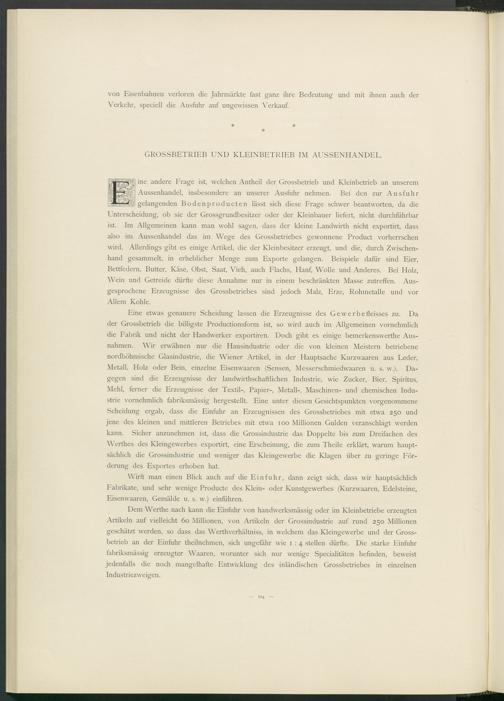 Eine etwas genauere Scheidung lassen die Erzeugnisse des Gewerbefleisses zu. Da der Grossbetrieb die billigste Productionsform ist, so wird auch im Allgemeinen vornehmlich die Fabrik und nicht der Handwerker exportiren. Doch gibt es einige bemerkenswerthe Ausnahmen. Wir erwähnen nur die Hausindustrie oder die von kleinen Meistern betriebene nordböhmische Glasindustrie, die Wiener Artikel, in der Hauptsache Kurzwaaren aus Leder, Metall, Holz oder Bein, einzelne Eisenwaaren (Sensen, Messerschmiedwaaren u. s. w.). Dagegen sind die Erzeugnisse der landwirthschaftlichen Industrie, wie Zucker, Bier, Spiritus, Mehl, ferner die Erzeugnisse der Textil-, Papier-, Metall-, Maschinen- und chemischen Industrie vornehmlich fabriksmässig hergestellt. Eine unter diesen Gesichtspunkten vorgenommene Scheidung ergab, dass die Einfuhr an Erzeugnissen des Grossbetriebes mit etwa 250 und jene des kleinen und mittleren Betriebes mit etwa 100 Millionen Gulden veranschlagt werden kann. Sicher anzunehmen ist, dass die Grossindustrie das Doppelte bis zum Dreifachen des Werthes des Kleingewerbes exportirt, eine Erscheinung, die zum Theile erklärt, warum hauptsächlich die Grossindustrie und weniger das Kleingewerbe die Klagen über zu geringe Förderung des Exportes erhoben hat.