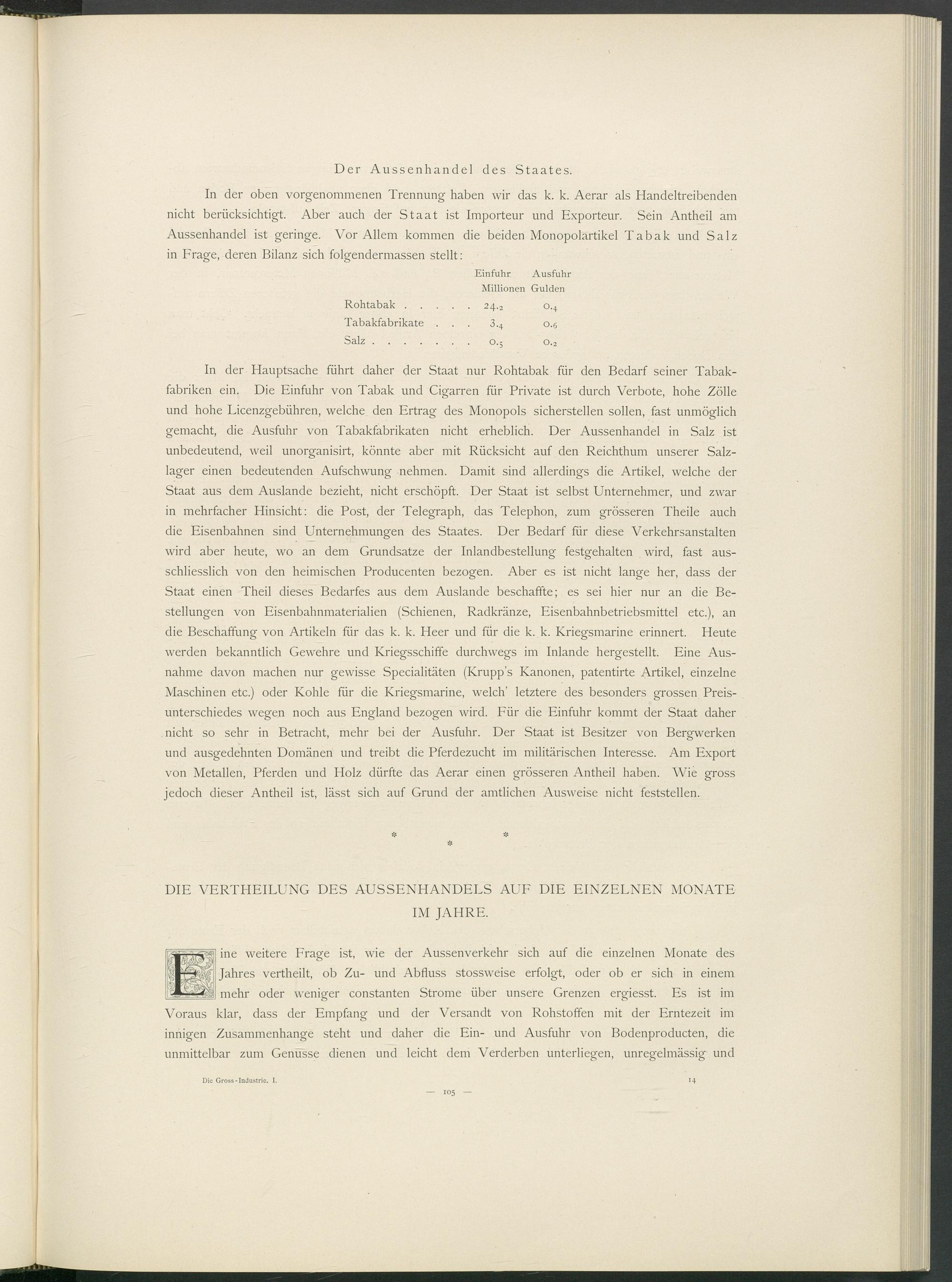 In der oben vorgenommenen Trennung haben wir das k. k. Aerar als Handeltreibenden nicht berücksichtigt. Aber auch der Staat ist Importeur und Exporteur. Sein Antheil am Aussenhandel ist geringe. Vor Allem kommen die beiden Monopolartikel Tabak und Salz in Frage, deren Bilanz sich folgendermassen stellt: