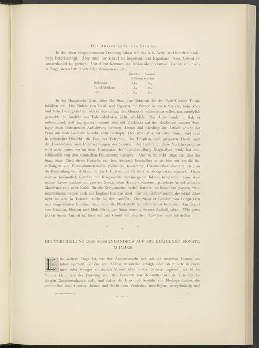 In der Hauptsache führt daher der Staat nur Rohtabak für den Bedarf seiner Tabakfabriken ein. Die Einfuhr von Tabak und Cigarren für Private ist durch Verbote, hohe Zölle und hohe Licenzgebühren, welche den Ertrag des Monopols sicherstellen sollen, fast unmöglich gemacht, die Ausfuhr von Tabakfabrikaten nicht erheblich. Der Aussenhandel in Salz ist unbedeutend, weil unorganisirt, könnte aber mit Rücksicht auf den Reichthum unserer Salzlager einen bedeutenden Aufschwung nehmen. Damit sind allerdings die Artikel, welche der Staat aus dem Auslande bezieht, nicht erschöpft. Der Staat ist selbst Unternehmer, und zwar in mehrfacher Hinsicht: die Post, der Telegraph, das Telephon, zum grösseren Theile auch die Eisenbahnen sind Unternehmungen des Staates. Der Bedarf für diese Verkehrsanstalten wird aber heute, wo an dem Grundsätze der Inlandbestellung festgehalten wird, fast ausschliesslich von den heimischen Producenten bezogen. Aber es ist nicht lange her, dass der Staat einen Theil dieses Bedarfes aus dem Auslande beschaffte; es sei hier nur an die Bestellungen von Eisenbahnmaterialien (Schienen, Radkränze, Eisenbahnbetriebsmittel etc.), an die Beschaffung von Artikeln für das k. k. Heer und für die k. k. Kriegsmarine erinnert. Heute werden bekanntlich Gewehre und Kriegsschiffe durchwegs im Inlande hergestellt. Eine Ausnahme davon machen nur gewisse Specialitäten (Krupps Kanonen, patentirte Artikel, einzelne Maschinen etc.) oder Kohle für die Kriegsmarine, welch’ letztere des besonders grossen Preisunterschiedes wegen noch aus England bezogen wird. Für die Einfuhr kommt der Staat daher nicht so sehr in Betracht, mehr bei der Ausfuhr. Der Staat ist Besitzer von Bergwerken und ausgedehnten Domänen und treibt die Pferdezucht im militärischen Interesse. Am Export von Metallen, Pferden und Holz dürfte das Aerar einen grösseren Antheil haben. Wie gross jedoch dieser Antheil ist, lässt sich auf Grund der amtlichen Ausweise nicht feststellen.