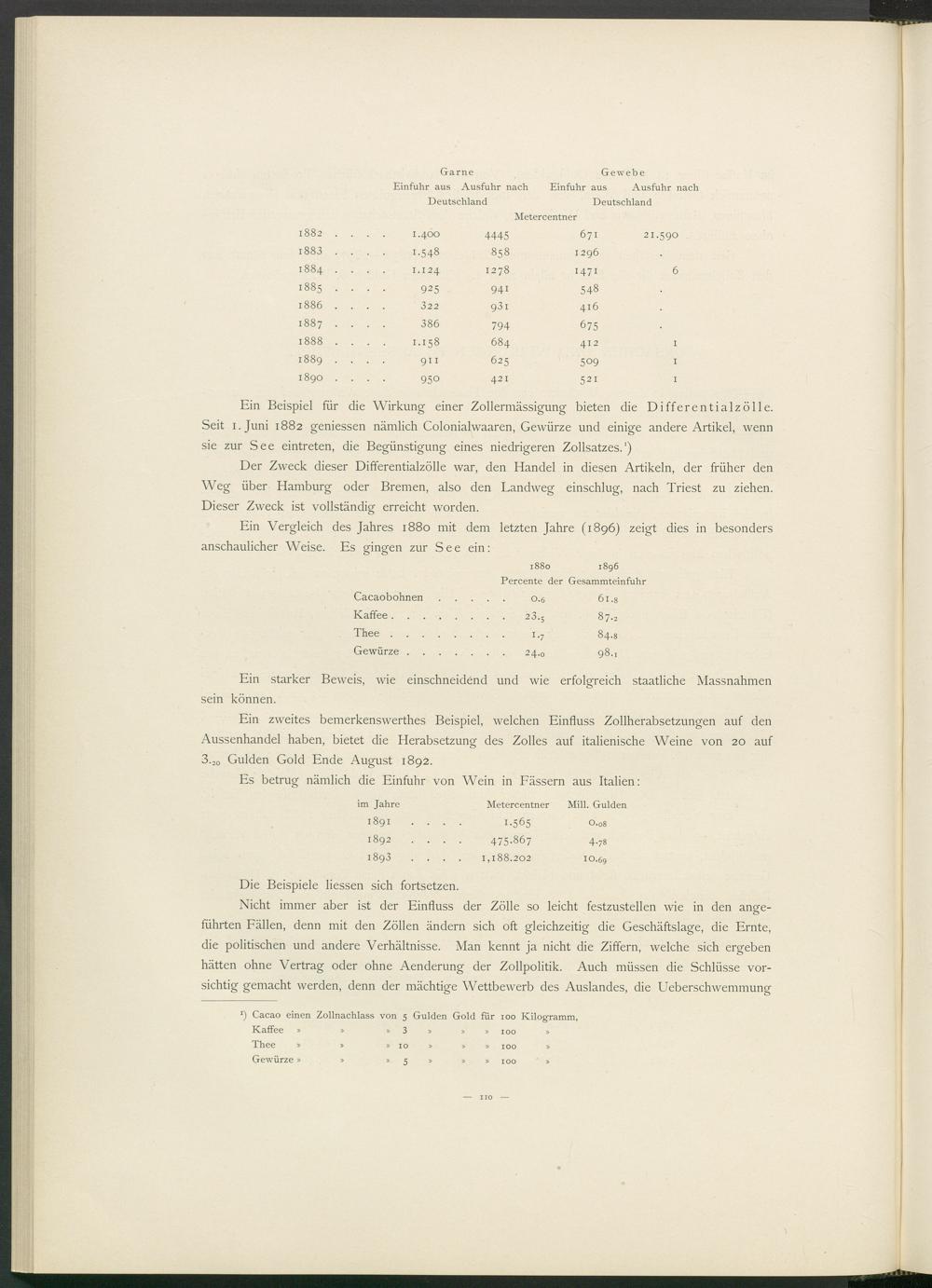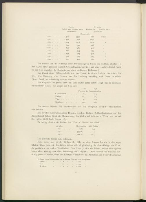 Ein Beispiel für die Wirkung einer Zollermässigung bieten die Differentialzölle. Seit i.Juni 1882 geniessen nämlich Colonialwaaren, Gewürze und einige andere Artikel, wenn sie zur See eintreten, die Begünstigung eines niedrigeren Zollsatzes. 1 )
