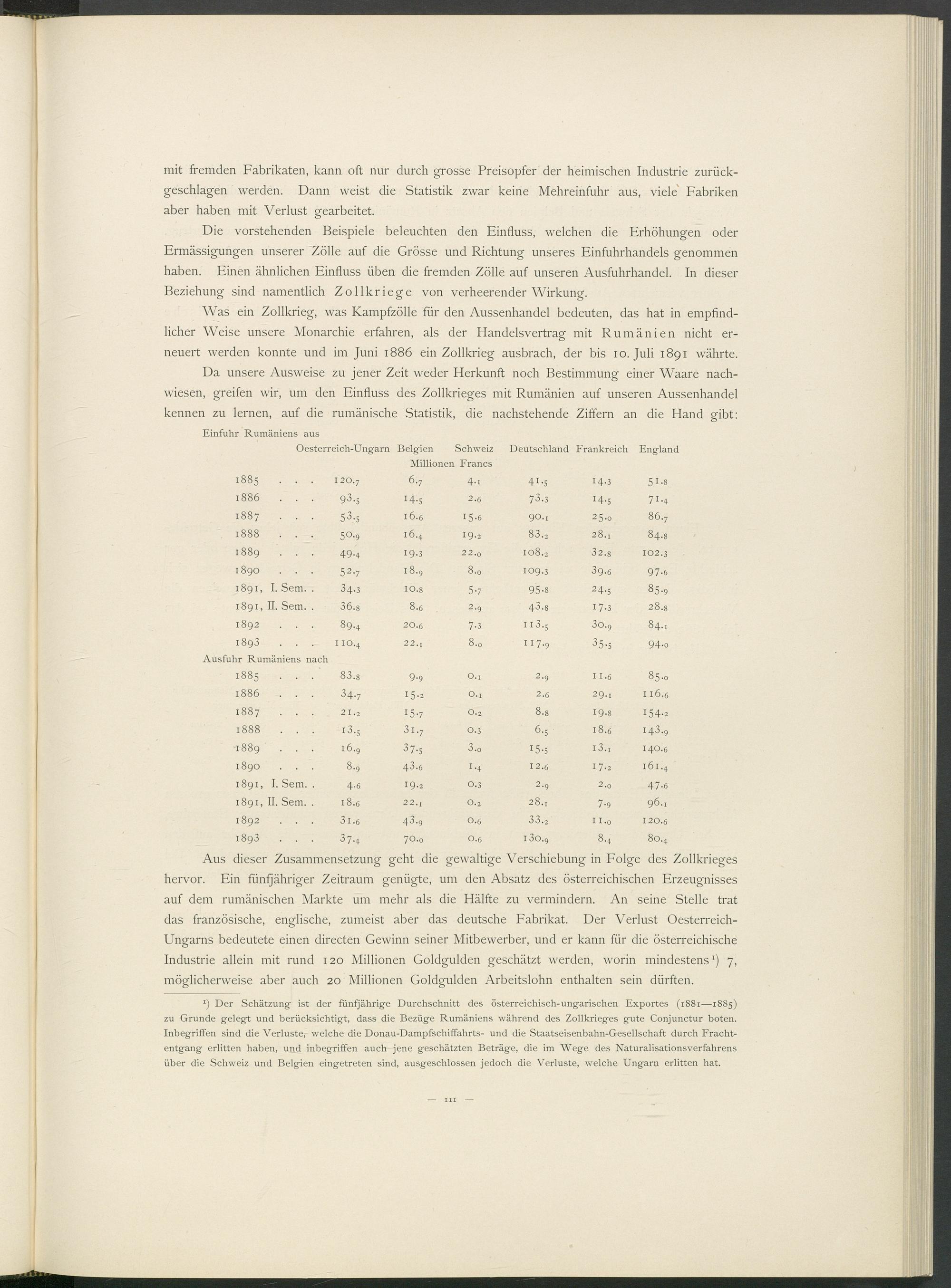 Aus dieser Zusammensetzung geht die gewaltige Verschiebung in Folge des Zollkrieges hervor. Ein fünfjähriger Zeitraum genügte, um den Absatz des österreichischen Erzeugnisses auf dem rumänischen Markte um mehr als die Hälfte zu vermindern. An seine Stelle trat das französische, englische, zumeist aber das deutsche Fabrikat. Der Verlust Oesterreich- Ungarns bedeutete einen directen Gewinn seiner Mitbewerber, und er kann für die österreichische Industrie allein mit rund 120 Millionen Goldgulden geschätzt werden, worin mindestens 1 ) 7, möglicherweise aber auch 20 Millionen Goldgulden Arbeitslohn enthalten sein dürften.