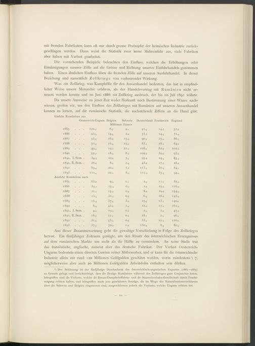 I ) Der Schätzung - ist der fünfjährige Durchschnitt des österreichisch-ungarischen Exportes (1881—1885) zu Grunde gelegt und berücksichtigt, dass die Bezüge Rumäniens während des Zollkrieges gute Conjunctur boten. Inbegriffen sind die Verluste, welche die Donau-Dampfschiffahrts- und die Staatseisenbahn-Gesellschaft durch Fracht- entgang erlitten haben, und inbegriffen auch jene geschätzten Beträge, die im Wege des Naturalisationsverfahrens über die Schweiz und Belgien eingetreten sind, ausgeschlossen jedoch die Verluste, welche Ungarn erlitten hat.