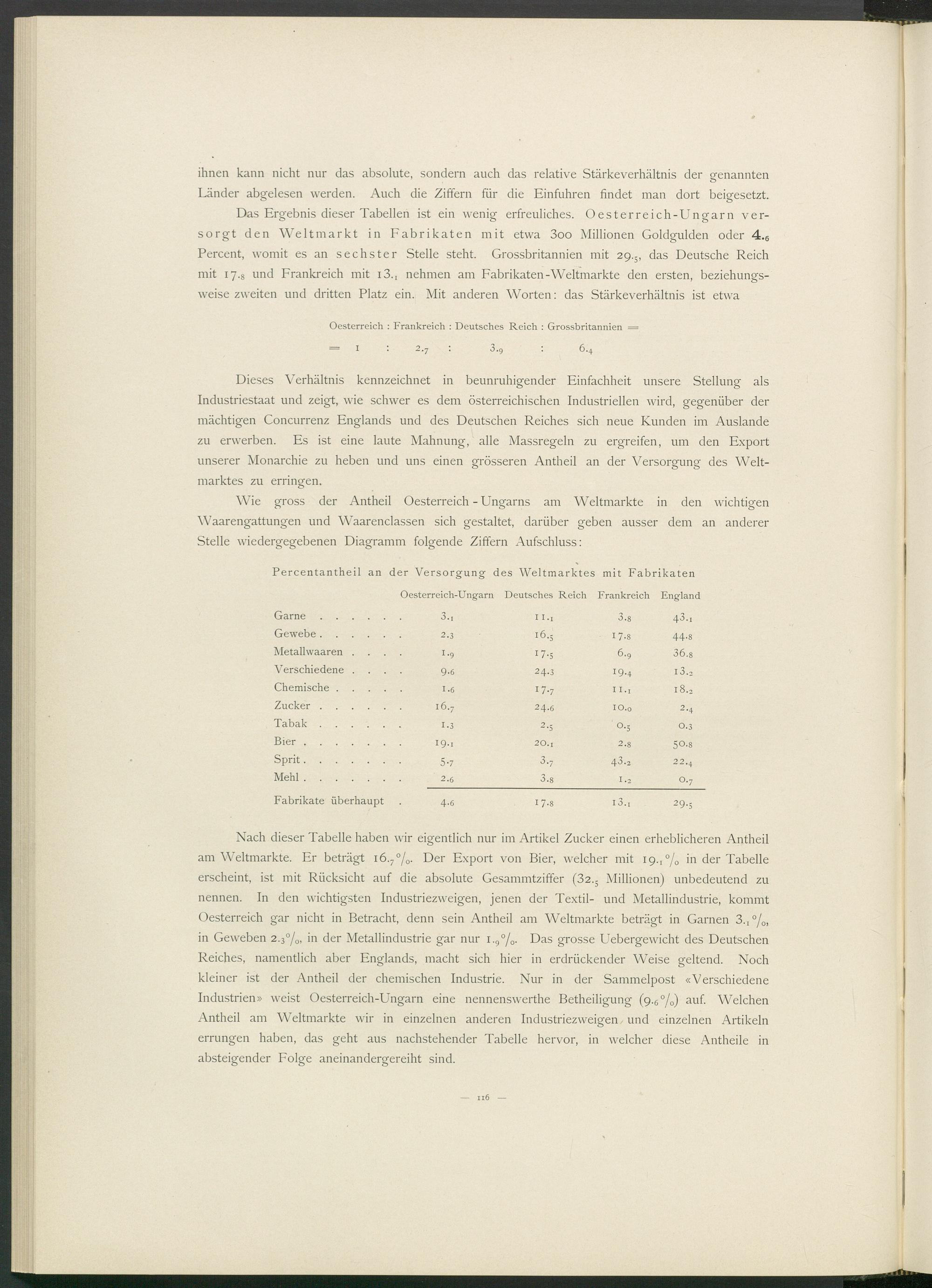Das Ergebnis dieser Tabellen ist ein wenig erfreuliches. Oesterreich-Ungarn versorgt den Weltmarkt in Fabrikaten mit etwa 3 oo Millionen Goldgulden oder 4. 6 Percent, womit es an sechster Stelle steht. Grossbritannien mit 29.5, das Deutsche Reich mit 17.8 und Frankreich mit i 3 . t nehmen am Fabrikaten-Weltmärkte den ersten, beziehungsweise zweiten und dritten Platz ein. Mit anderen Worten: das Stärkeverhältnis ist etwa