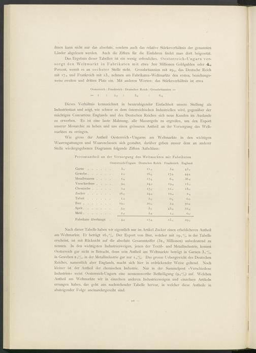 Nach dieser Tabelle haben wir eigentlich nur im Artikel Zucker einen erheblicheren Antheil am Weltmärkte. Er beträgt 16, 7 °/ 0 . Der Export von Bier, welcher mit 19.!% in der Tabelle erscheint, ist mit Rücksicht auf die absolute Gesammtziffer ( 32. 3 Millionen) unbedeutend zu nennen. In den wichtigsten Industriezweigen, jenen der Textil- und Metallindustrie, kommt Oesterreich gar nicht in Betracht, denn sein Antheil am Weltmärkte beträgt in Garnen 3 .i°/ 0 , in Geweben 2. 3 °/ 0 , in der Metallindustrie gar nur i. 9 °/ 0 . Das grosse Uebergewicht des Deutschen Reiches, namentlich aber Englands, macht sich hier in erdrückender Weise geltend. Noch kleiner ist der Antheil der chemischen Industrie. Nur in der Sammelpost «Verschiedene Industrien» weist Oesterreich-Ungarn eine nennenswerthe Betheiligung (9.6%) auf. Welchen Antheil am Weltmärkte wir in einzelnen anderen Industriezweigen und einzelnen Artikeln errungen haben, das geht aus nachstehender Tabelle hervor, in welcher diese Antheile in absteigender Folge aneinandergereiht sind.