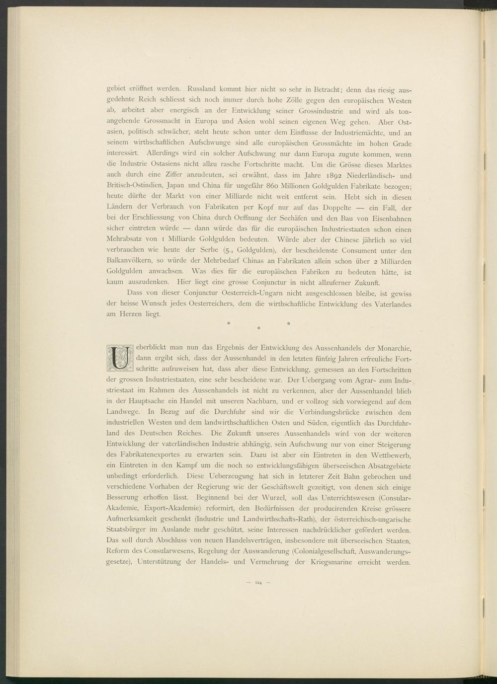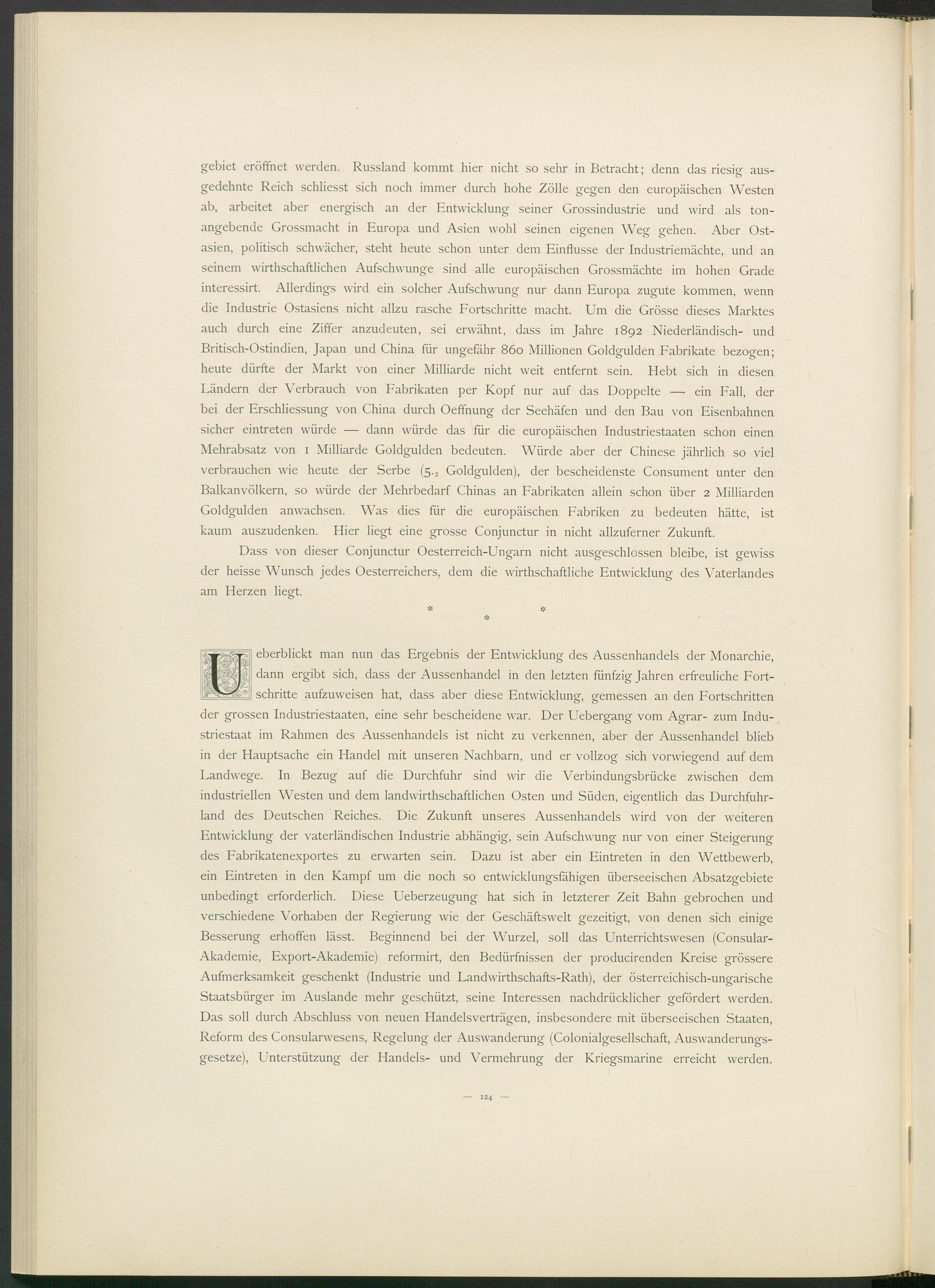 eberblickt man nun das Ergebnis der Entwicklung des Aussenhandels der Monarchie, dann ergibt sich, dass der Aussenhandel in den letzten fünfzig Jahren erfreuliche Fortschritte aufzuweisen hat, dass aber diese Entwicklung, gemessen an den Fortschritten der grossen Industriestaaten, eine sehr bescheidene war. Der Uebergang vom Agrar- zum Industriestaat im Rahmen des Aussenhandels ist nicht zu verkennen, aber der Aussenhandel blieb in der Hauptsache ein Handel mit unseren Nachbarn, und er vollzog sich vorwiegend auf dem Landwege. In Bezug auf die Durchfuhr sind wir die Verbindungsbrücke zwischen dem industriellen Westen und dem landwirthschaftlichen Osten und Süden, eigentlich das Durchfuhrland des Deutschen Reiches. Die Zukunft unseres Aussenhandels wird von der weiteren Entwicklung der vaterländischen Industrie abhängig, sein Aufschwung nur von einer Steigerung des Fabrikatenexportes zu erwarten sein. Dazu ist aber ein Eintreten in den Wettbewerb, ein Eintreten in den Kampf um die noch so entwicklungsfähigen überseeischen Absatzgebiete unbedingt erforderlich. Diese Ueberzeugung hat sich in letzterer Zeit Bahn gebrochen und verschiedene Vorhaben der Regierung wie der Geschäftswelt gezeitigt, von denen sich einige Besserung erhoffen lässt. Beginnend bei der Wurzel, soll das Unterrichtswesen (Consular- Akademie, Export-Akademie) reformirt, den Bedürfnissen der producirenden Kreise grössere Aufmerksamkeit geschenkt (Industrie und Landwirthschafts-Rath), der österreichisch-ungarische Staatsbürger im Auslande mehr geschützt, seine Interessen nachdrücklicher gefördert werden. Das soll durch Abschluss von neuen Handelsverträgen, insbesondere mit überseeischen Staaten, Reform des Consularwesens, Regelung der Auswanderung (Colonialgesellschaft, Auswanderungsgesetze), L'nterstützung der Handels- und Vermehrung der Kriegsmarine erreicht werden.