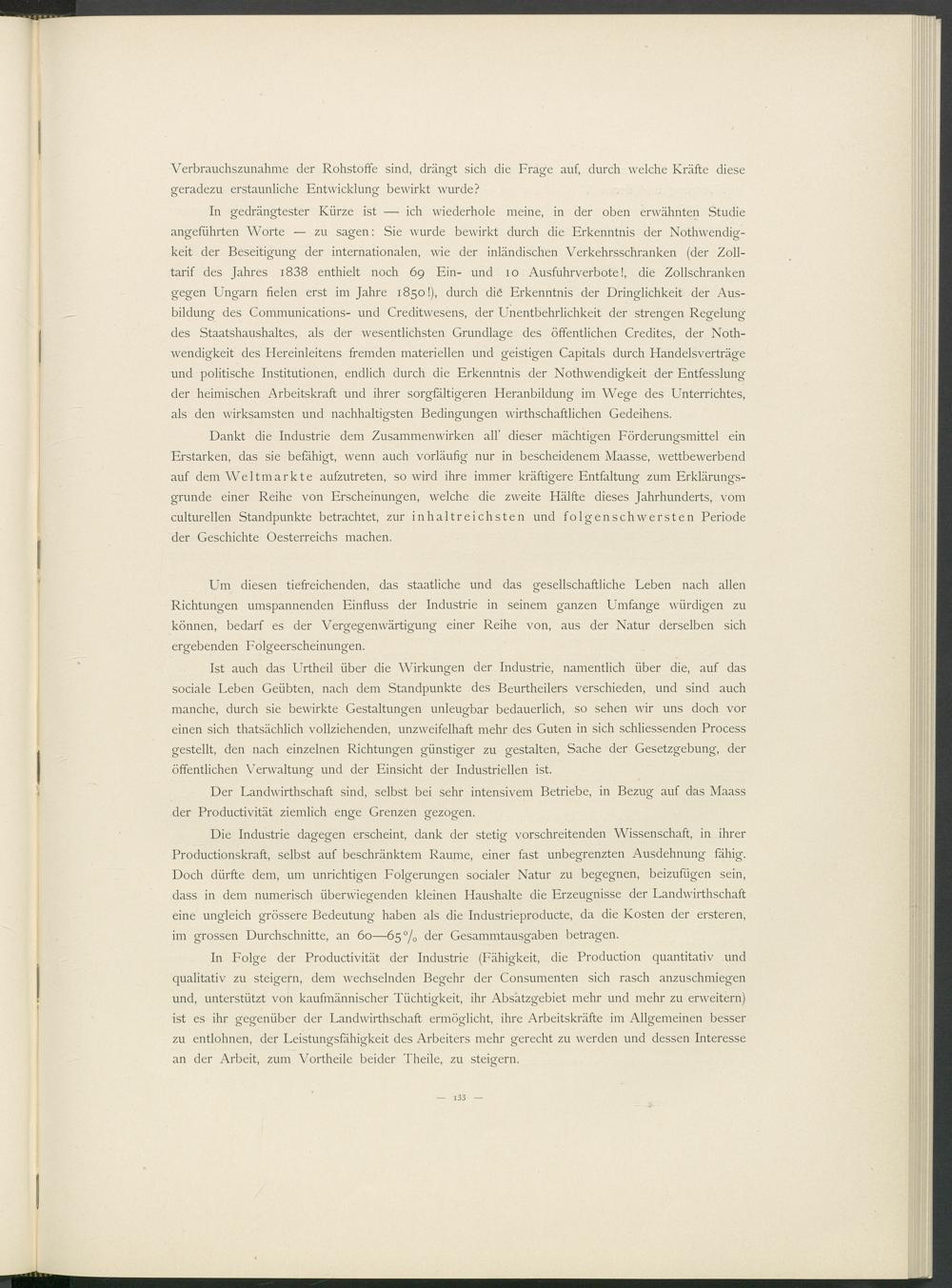 Dankt die Industrie dem Zusammenwirken all’ dieser mächtigen Förderungsmittel ein Erstarken, das sie befähigt, wenn auch vorläufig nur in bescheidenem Maasse, wettbewerbend auf dem Weltmärkte aufzutreten, so wird ihre immer kräftigere Entfaltung zum Erklärungsgrunde einer Reihe von Erscheinungen, welche die zweite Hälfte dieses Jahrhunderts, vom culturellen Standpunkte betrachtet, zur inhaltreichsten und folgenschwersten Periode der Geschichte Oesterreichs machen.
