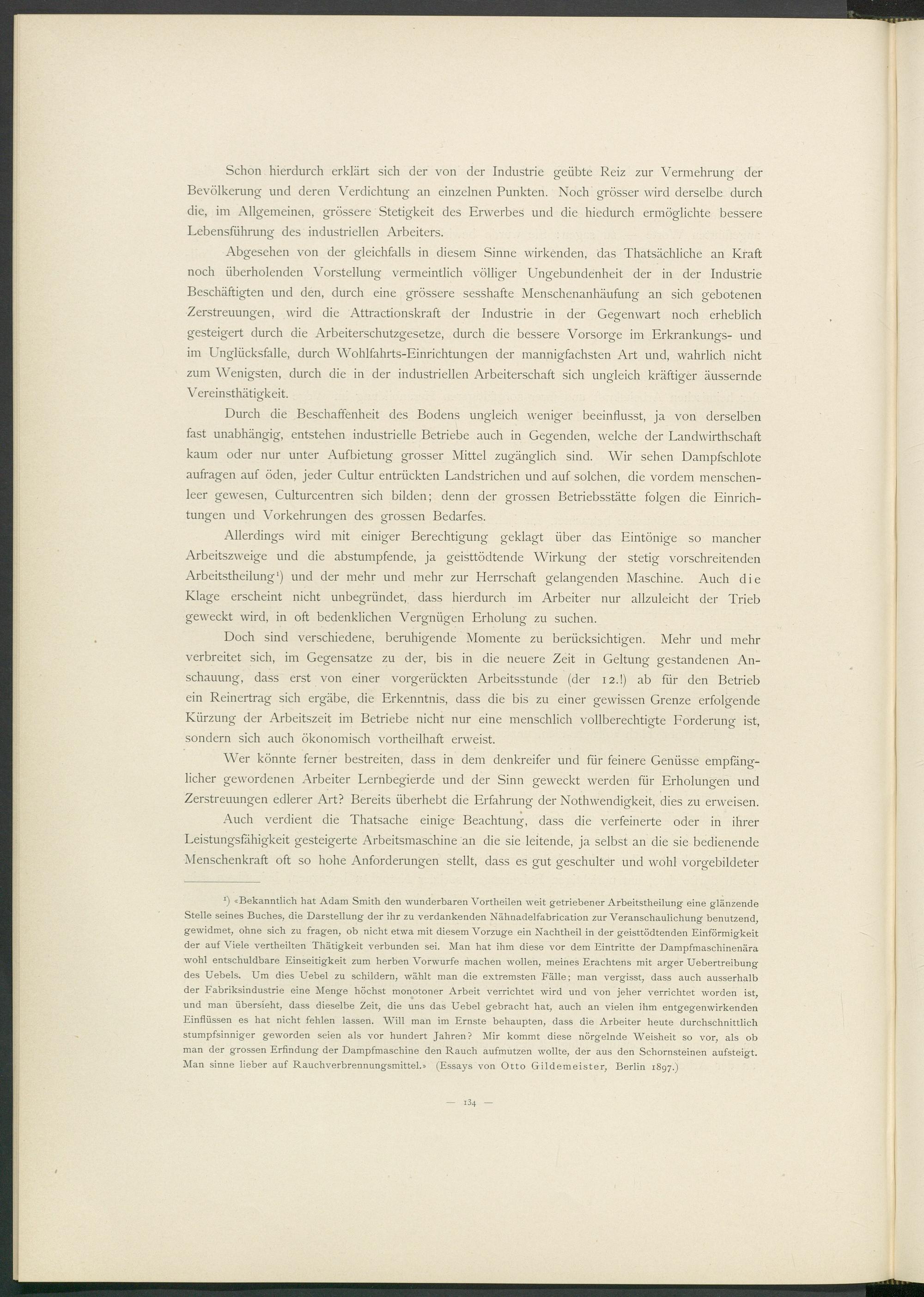 fl «Bekanntlich hat Adam Smith den wunderbaren Vortheilen weit getriebener Arbeitstheilung eine glänzende Stelle seines Buches, die Darstellung der ihr zu verdankenden Nähnadelfabrication zur Veranschaulichung benutzend, gewidmet, ohne sich zu fragen, ob nicht etwa mit diesem Vorzüge ein Nachtheil in der geisttödtenden Einförmigkeit der auf Viele vertheilten Thätigkeit verbunden sei. Man hat ihm diese vor dem Eintritte der Dampfmaschinenära wohl entschuldbare Einseitigkeit zum herben Vorwurfe machen wollen, meines Erachtens mit arger Uebertreibung des Uebels. Um dies Uebel zu schildern, wählt man die extremsten Fälle; man vergisst, dass auch ausserhalb der Fabriksindustrie eine Menge höchst monotoner Arbeit verrichtet wird und von jeher verrichtet worden ist, und man übersieht, dass dieselbe Zeit, die uns das Uebel gebracht hat, auch an vielen ihm entgegenwirkenden Einflüssen es hat nicht fehlen lassen. Will man im Ernste behaupten, dass die Arbeiter heute durchschnittlich stumpfsinniger geworden seien als vor hundert Jahren? Mir kommt diese nörgelnde Weisheit so vor, als ob man der grossen Erfindung der Dampfmaschine den Rauch aufmutzen wollte, der aus den Schornsteinen aufsteigt. Man sinne lieber auf Rauch verbrennungsmittel.» (Essays von Otto Gildemeister, Berlin 1897.)