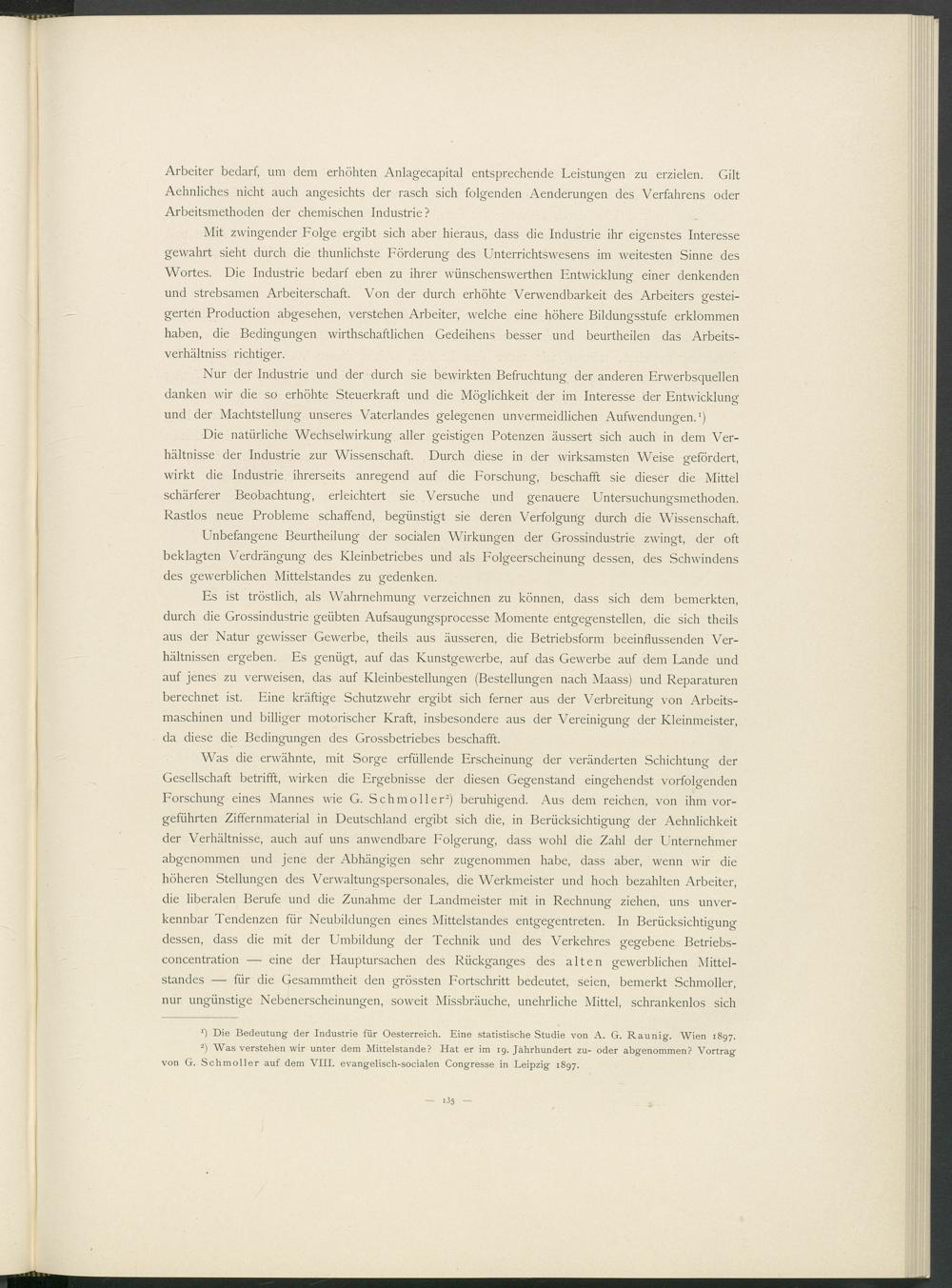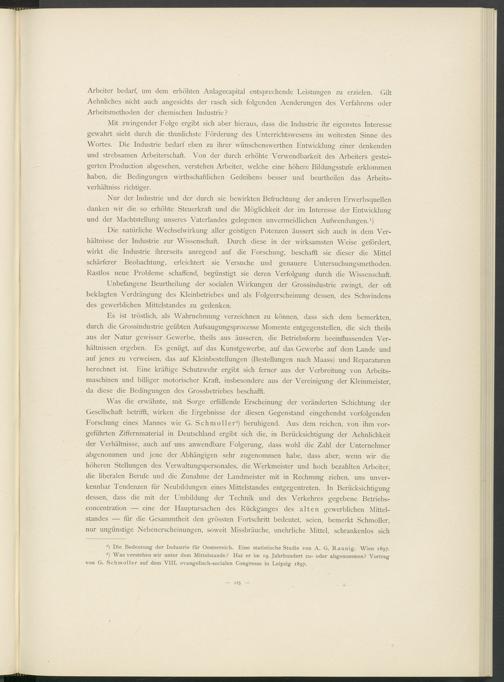 Mit zwingender Folge ergibt sich aber hieraus, dass die Industrie ihr eigenstes Interesse gewahrt sieht durch die thunlichste Förderung des Unterrichtswesens im weitesten Sinne des Wortes. Die Industrie bedarf eben zu ihrer wünschenswerthen Entwicklung - einer denkenden und strebsamen Arbeiterschaft. Von der durch erhöhte Verwendbarkeit des Arbeiters gesteigerten Production abgesehen, verstehen Arbeiter, welche eine höhere Bildungsstufe erklommen haben, die Bedingungen wirthschaftlichen Gedeihens besser und beurtheilen das Arbeits- verhältniss richtiger.
