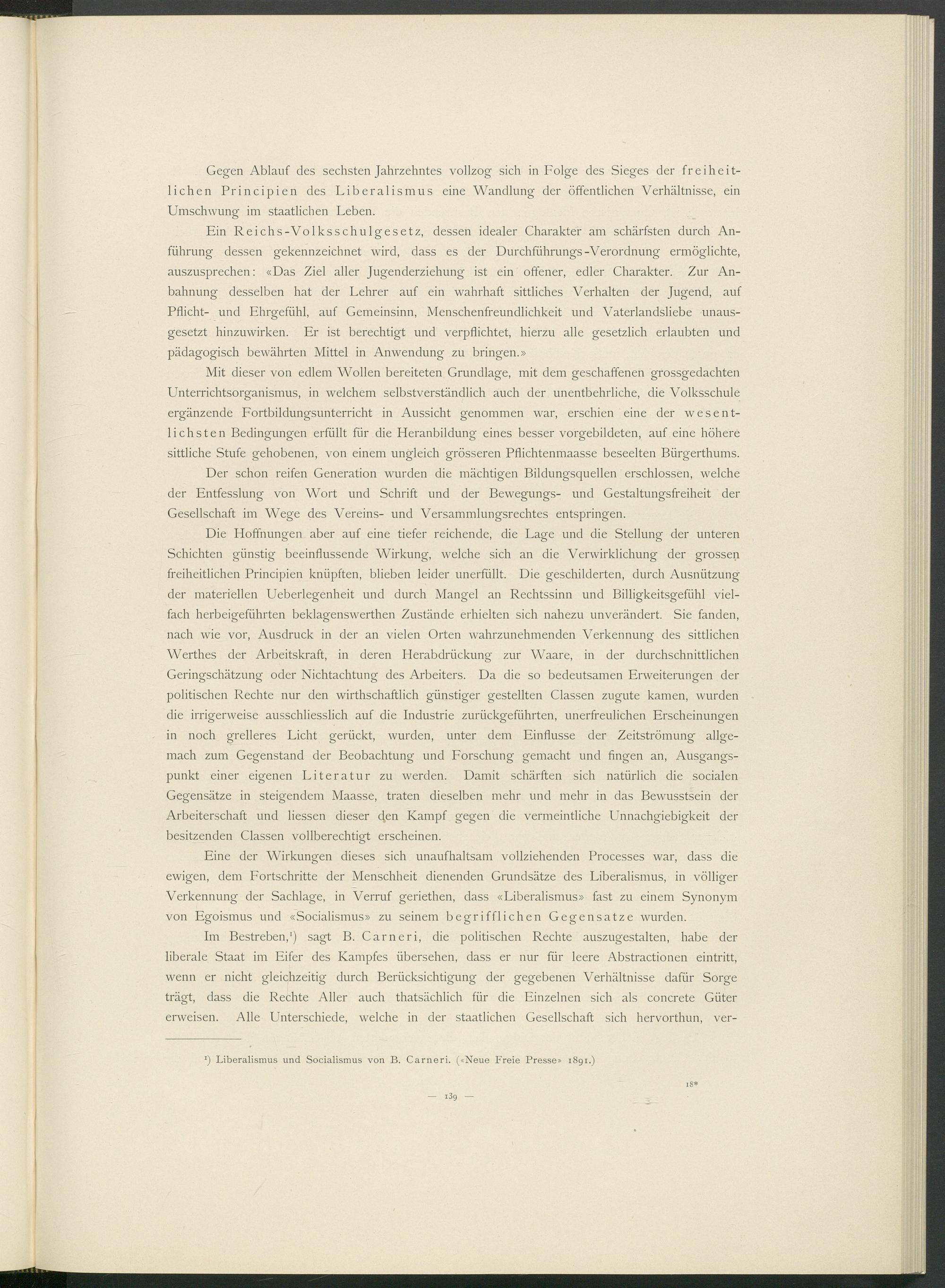 Eine der Wirkungen dieses sich unaufhaltsam vollziehenden Processes war, dass die ewigen, dem Fortschritte der Menschheit dienenden Grundsätze des Liberalismus, in völliger Verkennung der Sachlage, in Verruf geriethen, dass «Liberalismus» fast zu einem Synonym von Egoismus und «Socialismus» zu seinem begrifflichen Gegensätze wurden.