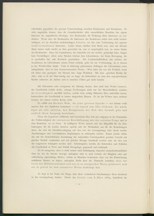 schwänden gegenüber der grossen Unterscheidung zwischen Besitzenden und Besitzlosen. Es wäre angesichts dessen, dass die Grundtriebfeder alles menschlichen Handelns das eigene Interesse ist, unpraktische Ideologie, den Besitzenden die Wahrung ihres Interesses zu verdenken. Wenn aber die Besitzenden die Interessen der Besitzlosen selbst dort nicht berücksichtigen, wo sie dieselben berücksichtigen können, sei dies eine Verkennung des eigenen wohlverstandenen Interesses. Leider könne darüber kein Streit sein, dass der liberale Staat immer mehr wieder zu dem geworden ist, was er ursprünglich war, zu einem Staate der Besitzenden. Dass der Capitalismus, der immobile wie der mobile, gesündigt habe, leugne kein Vernünftiger; allein seine Sünden würden dem Liberalismus, der freien Bewegung, die er geschaffen hat, aufs Kerbholz geschnitten. Die Leidenschaftlichkeit, mit welcher der Socialismus im Liberalismus seinen Leind erblickt, gehe bis zur Verblendung, da er diesem ja das Werthvollste dankt. Viele in Schwung gekommene Anklagen des Liberalismus seien unbegründet, aber in dem herzzerreissenden Worte: «Was habe ich von der Lreiheit, wenn ich dabei eine geringere Art Mensch bin» liege Wahrheit. Mit dem «gleichen Rechte für Alle» sehe es in der That windig aus, so lange der Schwächere zu dem ihm zugesprochenen Rechte schwerer, als Andere und in manchen Lällen gar nicht kommt.