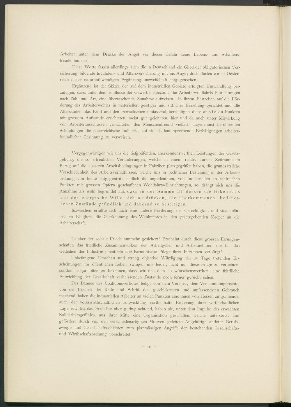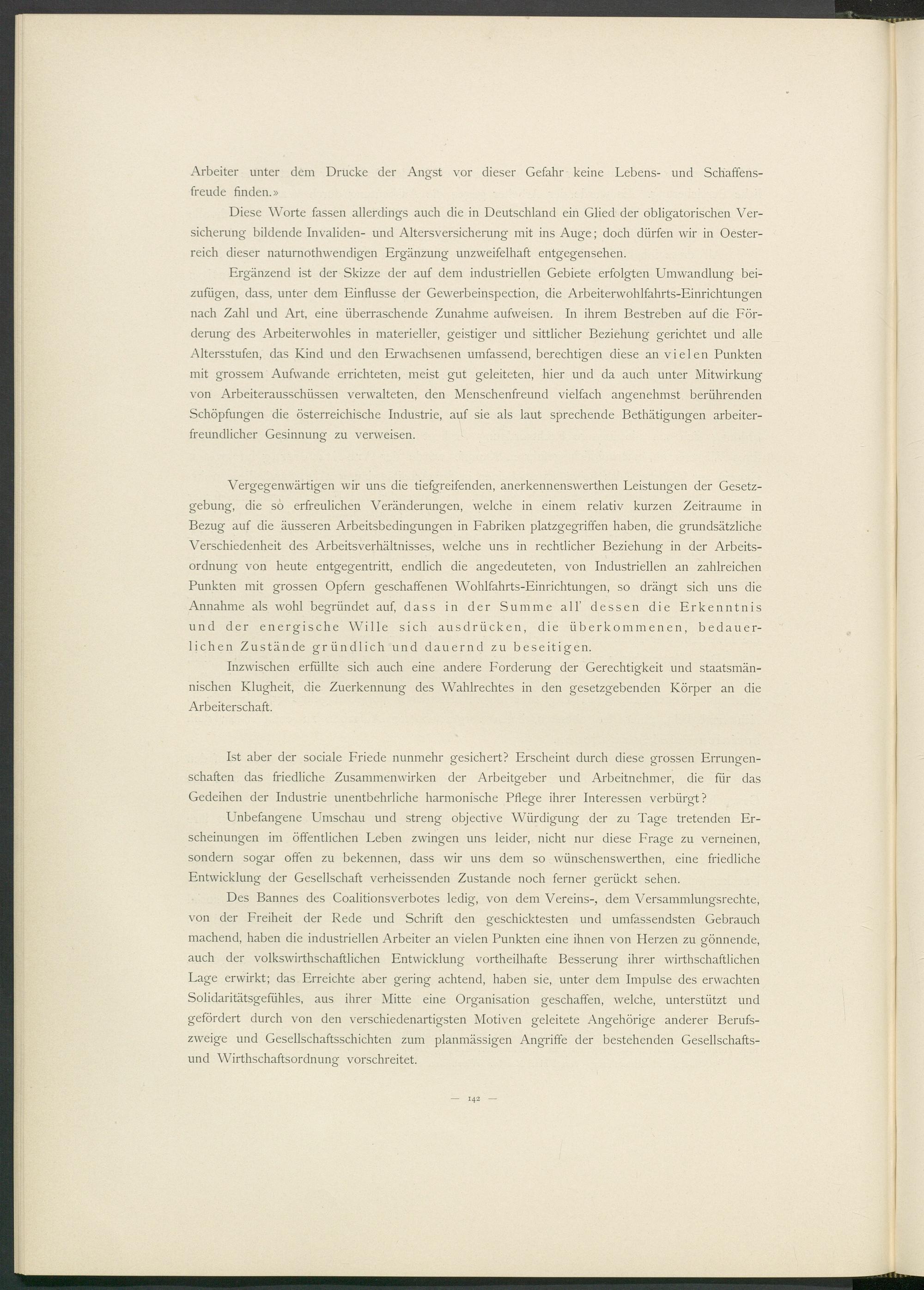 Vergegenwärtigen wir uns die tiefgreifenden, anerkennenswerthen Leistungen der Gesetzgebung, die so erfreulichen Veränderungen, welche in einem relativ kurzen Zeiträume in Bezug auf die äusseren Arbeitsbedingungen in Fabriken platzgegriffen haben, die grundsätzliche Verschiedenheit des Arbeitsverhältnisses, welche uns in rechtlicher Beziehung in der Arbeitsordnung von heute entgegentritt, endlich die angedeuteten, von Industriellen an zahlreichen Punkten mit grossen Opfern geschaffenen Wohlfahrts-Einrichtungen, so drängt sich uns die Annahme als wohl begründet auf, dass in der Summe all’ dessen die Erkenntnis und der energische Wille sich ausdrücken, die überkommenen, bedauerlichen Zustände gründlich und dauernd zu beseitigen.