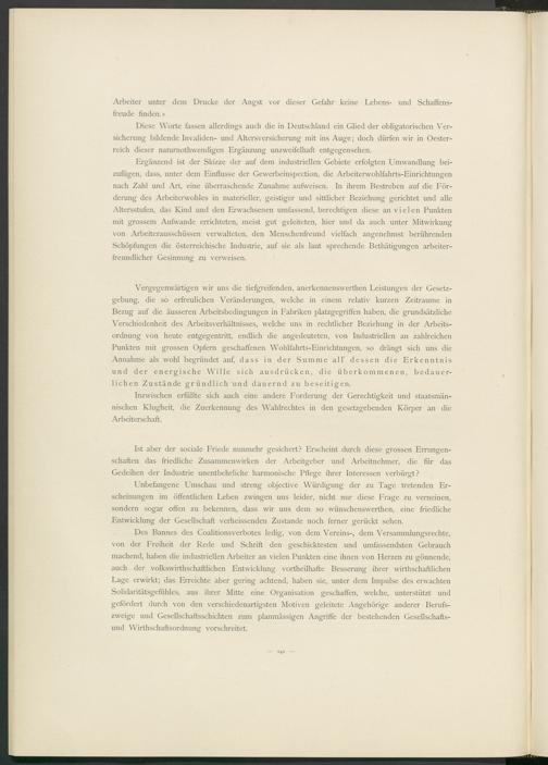 Des Bannes des Coalitionsverbotes ledig, von dem Vereins-, dem Versammlungsrechte, von der Freiheit der Rede und Schrift den geschicktesten und umfassendsten Gebrauch machend, haben die industriellen Arbeiter an vielen Punkten eine ihnen von Herzen zu gönnende, auch der volkswirtschaftlichen Entwicklung vorteilhafte Besserung ihrer wirtschaftlichen Lage erwirkt; das Erreichte aber gering achtend, haben sie, unter dem Impulse des erwachten Solidaritätsgefühles, aus ihrer Mitte eine Organisation geschaffen, welche, unterstützt und gefördert durch von den verschiedenartigsten Motiven geleitete Angehörige anderer Berufszweige und Gesellschaftsschichten zum planmässigen Angriffe der bestehenden Gesellschaftsund Wirtschaftsordnung vorschreitet.