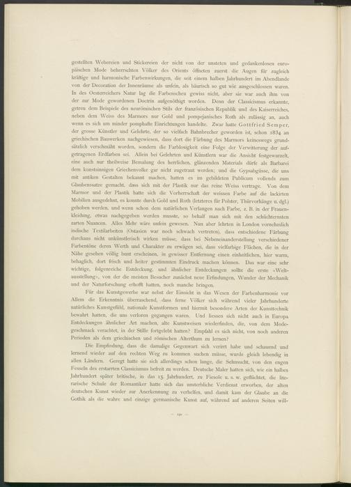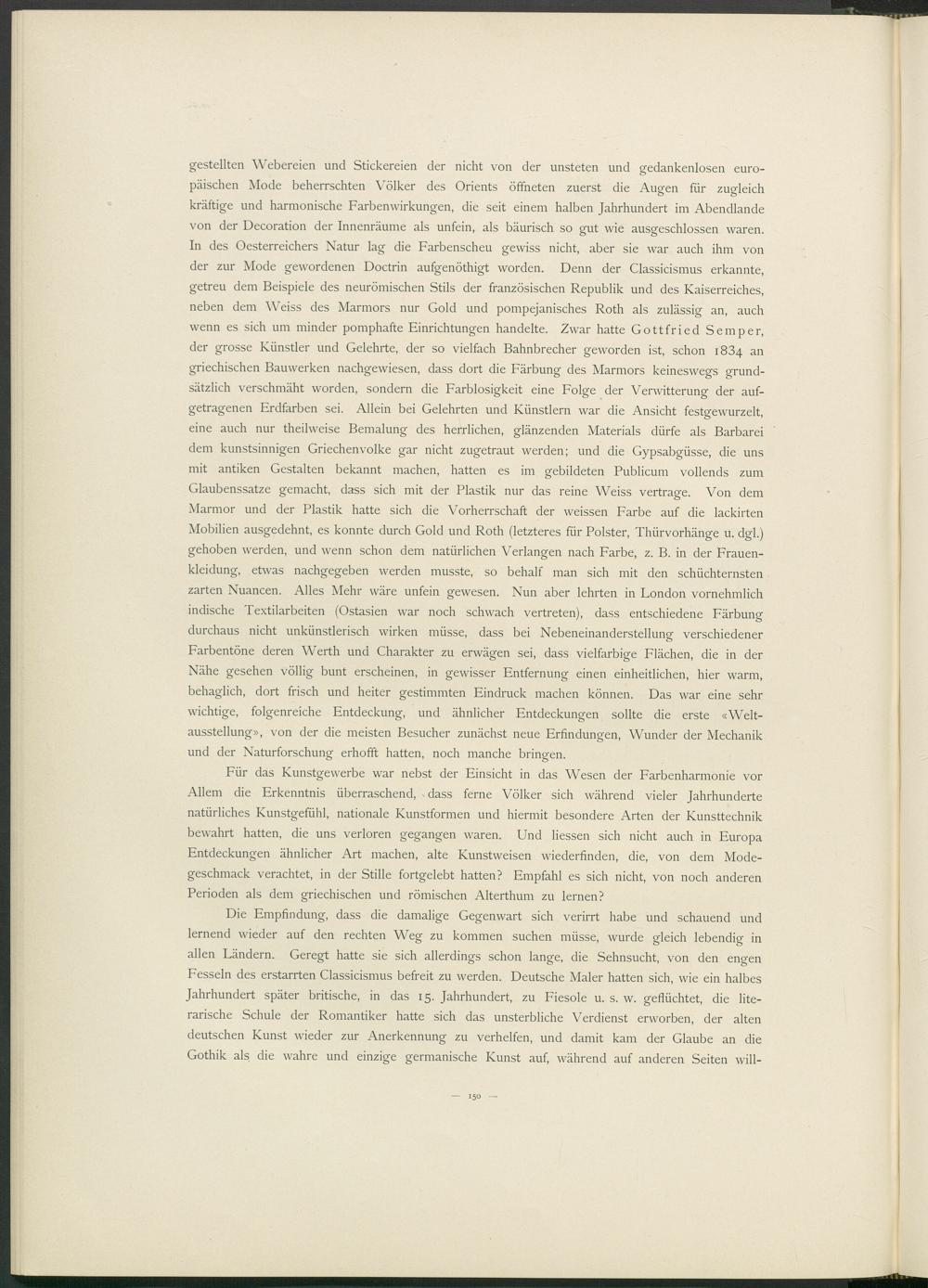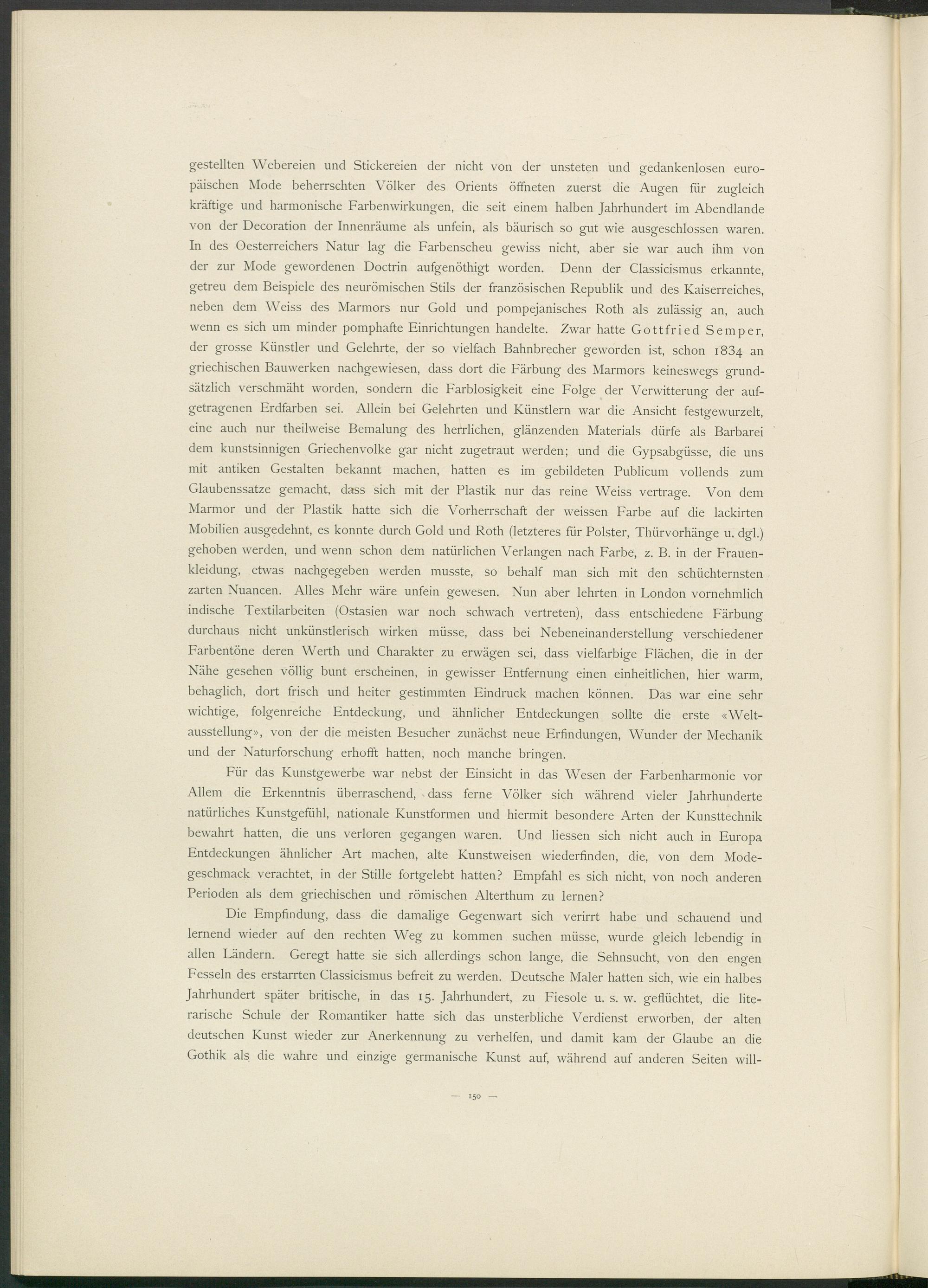gestellten Webereien und Stickereien der nicht von der unsteten und gedankenlosen europäischen Mode beherrschten Völker des Orients öffneten zuerst die Augen für zugleich kräftige und harmonische Farbenwirkungen, die seit einem halben Jahrhundert im Abendlande von der Decoration der Innenräume als unfein, als bäurisch so gut wie ausgeschlossen waren. In des Oesterreichers Natur lag die Farbenscheu gewiss nicht, aber sie war auch ihm von der zur Mode gewordenen Doctrin aufgenöthigt worden. Denn der Classicismus erkannte, getreu dem Beispiele des neurömischen Stils der französischen Republik und des Kaiserreiches, neben dem Weiss des Marmors nur Gold und pompejanisches Roth als zulässig an, auch wenn es sich um minder pomphafte Einrichtungen handelte. Zwar hatte Gottfried Semper, der grosse Künstler und Gelehrte, der so vielfach Bahnbrecher geworden ist, schon 1834 an griechischen Bauwerken nachgewiesen, dass dort die Färbung des Marmors keineswegs grundsätzlich verschmäht worden, sondern die Farblosigkeit eine Folge der Verwitterung der aufgetragenen Erdfarben sei. Allein bei Gelehrten und Künstlern war die Ansicht festgewurzelt, eine auch nur theilweise Bemalung des herrlichen, glänzenden Materials dürfe als Barbarei dem kunstsinnigen Griechenvolke gar nicht zugetraut werden; und die Gypsabgüsse, die uns mit antiken Gestalten bekannt machen, hatten es im gebildeten Publicum vollends zum Glaubenssatze gemacht, dass sich mit der Plastik nur das reine Weiss vertrage. Von dem Marmor und der Plastik hatte sich die Vorherrschaft der weissen Farbe auf die lackirten Mobilien ausgedehnt, es konnte durch Gold und Roth (letzteres für Polster, Thürvorhänge u. dgl.) gehoben werden, und wenn schon dem natürlichen Verlangen nach Farbe, z. B. in der Frauenkleidung, etwas nachgegeben werden musste, so behalf man sich mit den schüchternsten zarten Nuancen. Alles Mehr wäre unfein gewesen. Nun aber lehrten in London vornehmlich indische Textilarbeiten (Ostasien war noch schwach vertreten), dass entschiedene Färbung durchaus nicht unkünstlerisch wirken müsse, dass bei Nebeneinanderstelluncf verschiedener Farbentöne deren Werth und Charakter zu erwägen sei, dass vielfarbige Flächen, die in der Nähe gesehen völlig bunt erscheinen, in gewisser Entfernung einen einheitlichen, hier warm, behaglich, dort frisch und heiter gestimmten Eindruck machen können. Das war eine sehr wichtige, folgenreiche Entdeckung, und ähnlicher Entdeckungen sollte die erste «Weltausstellung», von der die meisten Besucher zunächst neue Erfindungen, Wunder der Mechanik und der Naturforschung erhofft hatten, noch manche bringen.