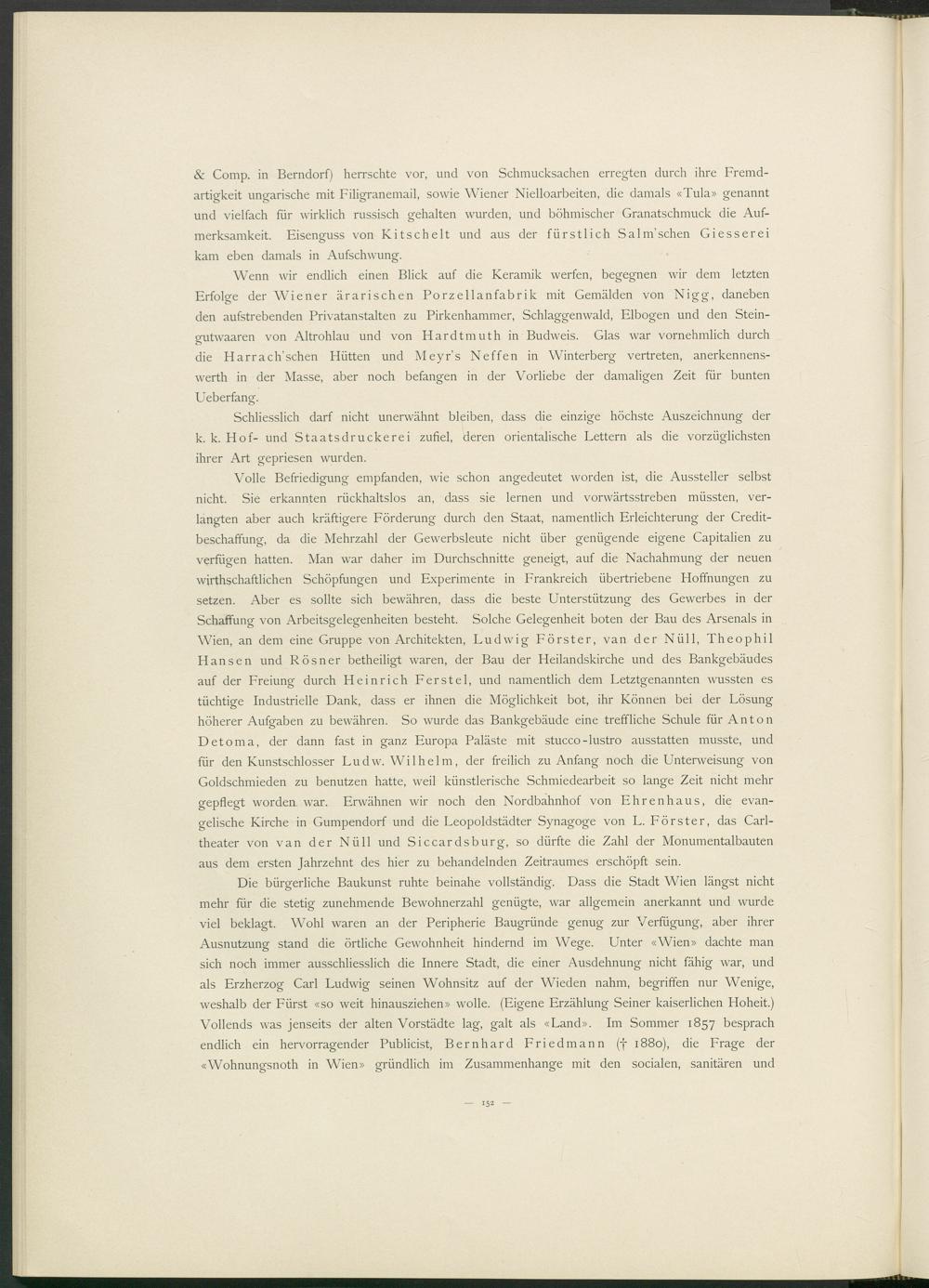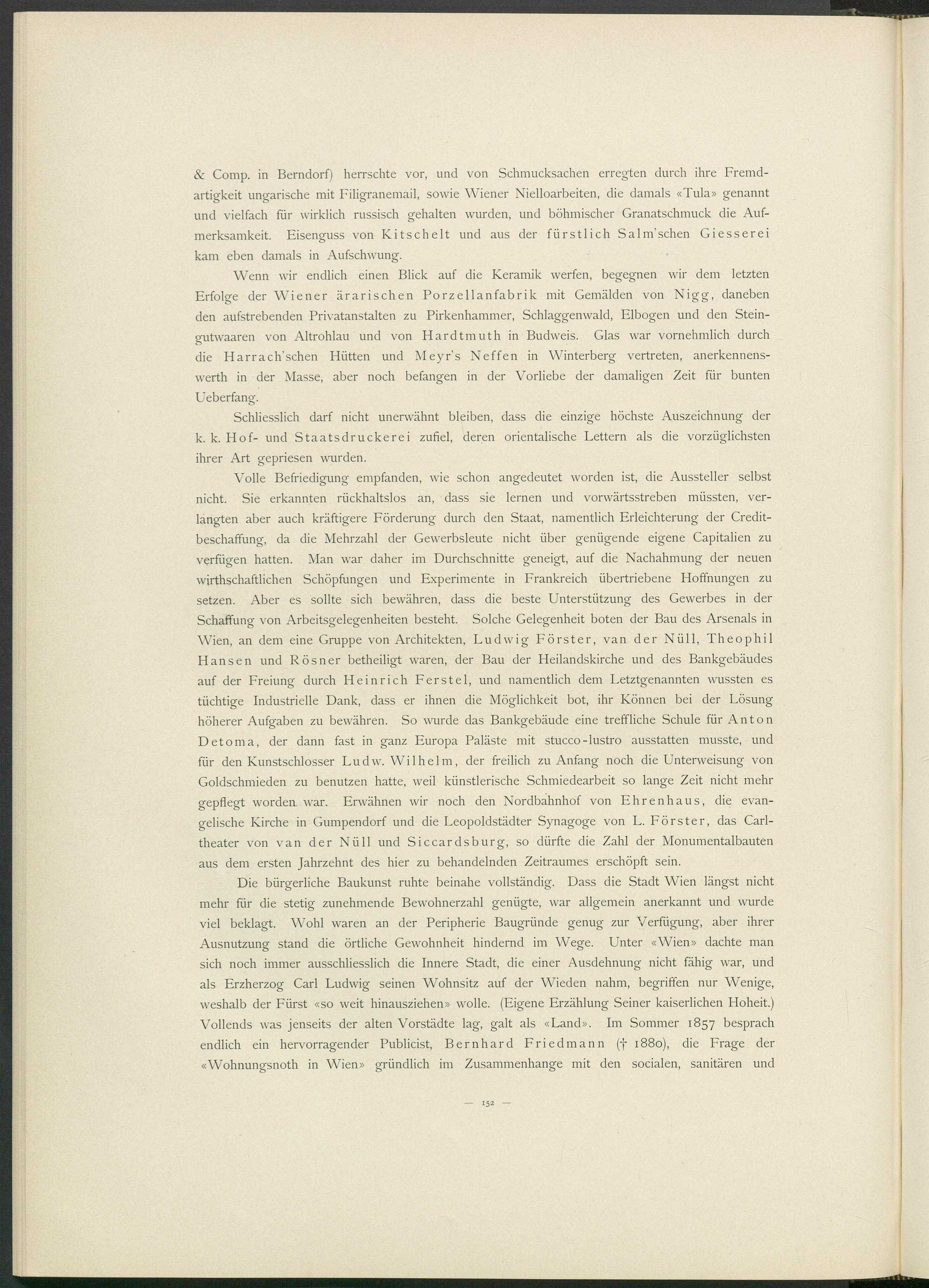 Volle Befriedigung empfanden, wie schon angedeutet worden ist, die Aussteller selbst nicht. Sie erkannten rückhaltslos an, dass sie lernen und vorwärtsstreben müssten, verlangten aber auch kräftigere Förderung durch den Staat, namentlich Erleichterung der Credit- beschaffung, da die Mehrzahl der Gewerbsleute nicht über genügende eigene Capitalien zu verfügen hatten. Man war daher im Durchschnitte geneigt, auf die Nachahmung der neuen wirthschaftlichen Schöpfungen und Experimente in Frankreich übertriebene Hoffnungen zu setzen. Aber es sollte sich bewähren, dass die beste Unterstützung des Gewerbes in der Schaffung von Arbeitsgelegenheiten besteht. Solche Gelegenheit boten der Bau des Arsenals in Wien, an dem eine Gruppe von Architekten, Ludwig Förster, van der Nüll, Theophil Hansen und Rösner betheiligt waren, der Bau der Heilandskirche und des Bankgebäudes auf der Freiung durch Heinrich Ferstel, und namentlich dem Letztgenannten wussten es tüchtige Industrielle Dank, dass er ihnen die Möglichkeit bot, ihr Können bei der Lösung höherer Aufgaben zu bewähren. So wurde das Bankgebäude eine treffliche Schule für Anton Detoma, der dann fast in ganz Europa Paläste mit stucco-lustro ausstatten musste, und für den Kunstschlosser Ludw. Wilhelm, der freilich zu Anfang noch die Unterweisung von Goldschmieden zu benutzen hatte, weil künstlerische Schmiedearbeit so lange Zeit nicht mehr gepflegt worden war. Erwähnen wir noch den Nordbahnhof von Ehrenhaus, die evangelische Kirche in Gumpendorf und die Leopoldstädter Synagoge von L. Förster, das Carl- theater von van der Nüll und Siccardsburg, so dürfte die Zahl der Monumentalbauten aus dem ersten Jahrzehnt des hier zu behandelnden Zeitraumes erschöpft sein.