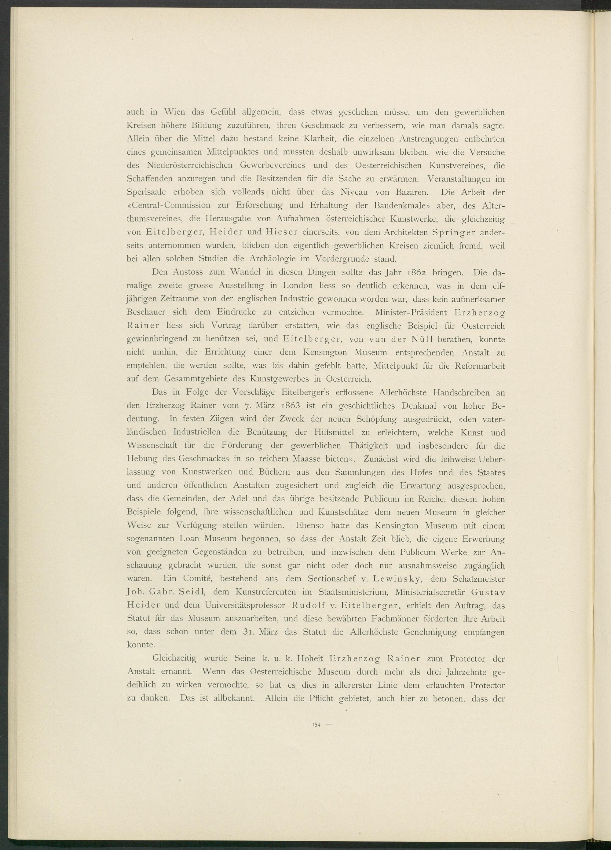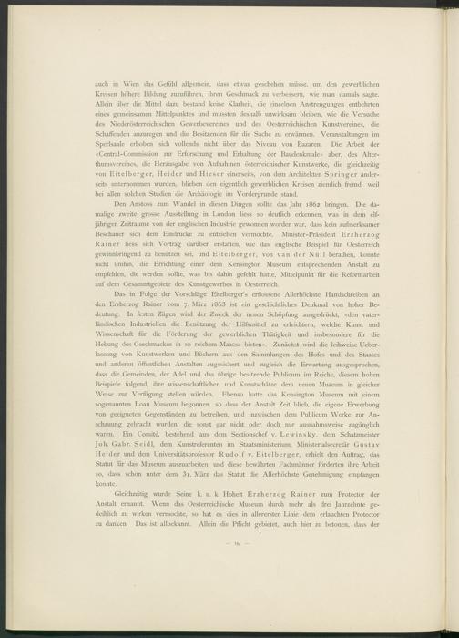 Gleichzeitig wurde Seine k. u. k. Hoheit Erzherzog Rainer zum Protector der Anstalt ernannt. Wenn das Oesterreichische Museum durch mehr als drei Jahrzehnte gedeihlich zu wirken vermochte, so hat es dies in allererster Linie dem erlauchten Protector zu danken. Das ist allbekannt. Allein die Pflicht gebietet, auch hier zu betonen, dass der