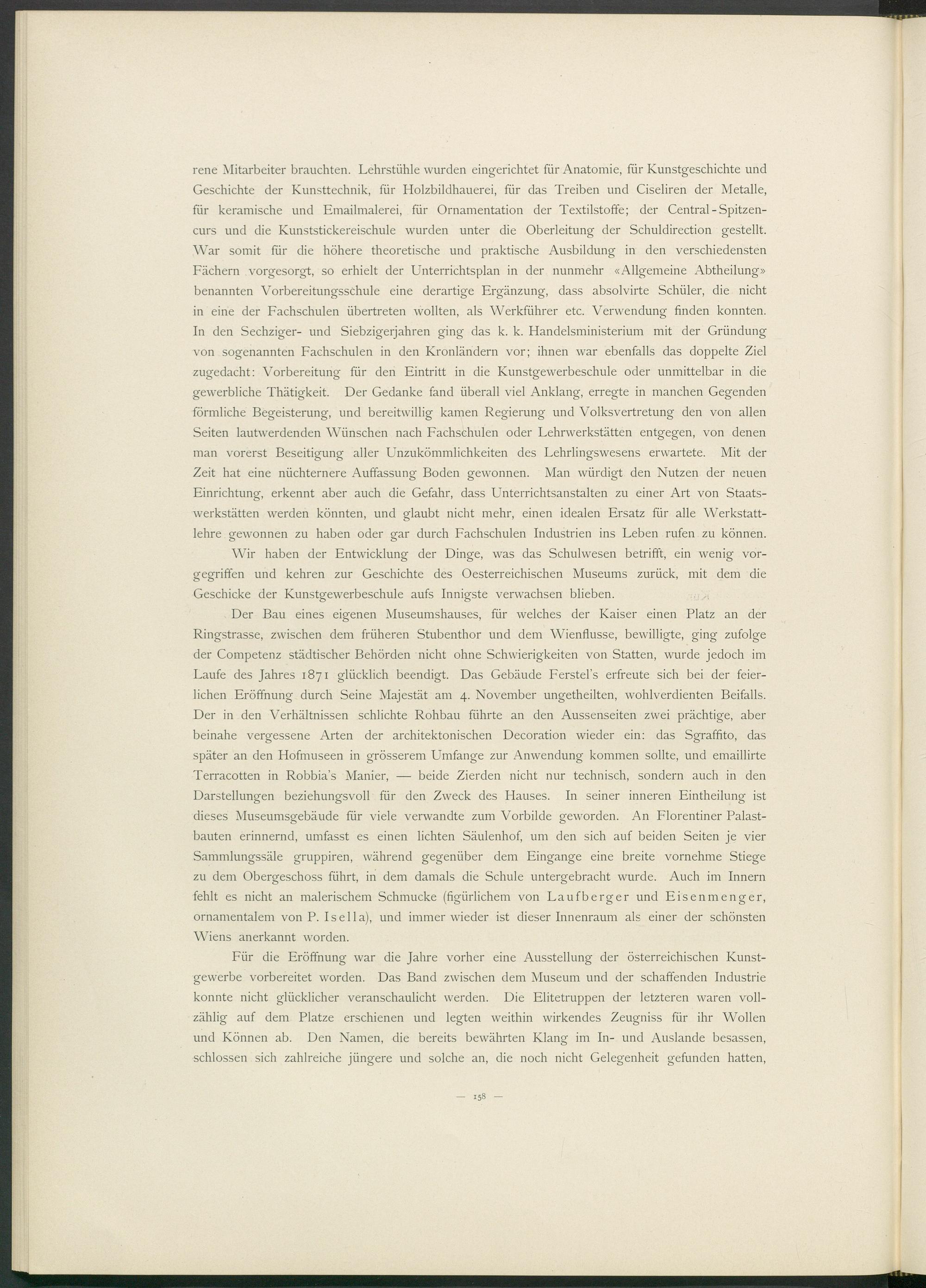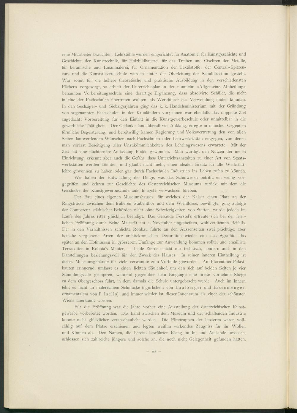 rene Mitarbeiter brauchten. Lehrstühle wurden eingerichtet für Anatomie, für Kunstgeschichte und Geschichte der Kunsttechnik, für Holzbildhauerei, für das Treiben und Ciseliren der Metalle, für keramische und Emailmalerei, für Ornamentation der Textilstoffe; der Central - Spitzen- curs und die Kunststickereischule wurden unter die Oberleitung der Schuldirection gestellt. War somit für die höhere theoretische und praktische Ausbildung in den verschiedensten Fächern vorgesorgt, so erhielt der Unterrichtsplan in der nunmehr «Allgemeine Abtheilung» benannten Vorbereitungsschule eine derartige Ergänzung, dass absolvirte Schüler, die nicht in eine der Fachschulen übertreten wollten, als Werkführer etc. Verwendung finden konnten. In den Sechziger- und Siebzigerjahren ging das k. k. Handelsministerium mit der Gründung von sogenannten Fachschulen in den Kronländern vor; ihnen war ebenfalls das doppelte Ziel zugedacht: Vorbereitung für den Eintritt in die Kunstgewerbeschule oder unmittelbar in die gewerbliche Thätigkeit. Der Gedanke fand überall viel Anklang, erregte in manchen Gegenden förmliche Begeisterung, und bereitwillig kamen Regierung und Volksvertretung den von allen Seiten lautwerdenden Wünschen nach Fachschulen oder Lehrwerkstätten entgegen, von denen man vorerst Beseitigung aller Unzukömmlichkeiten des Lehrlingswesens erwartete. Mit der Zeit hat eine nüchternere Auffassung Boden gewonnen. Man würdigt den Nutzen der neuen Einrichtung, erkennt aber auch die Gefahr, dass Unterrichtsanstalten zu einer Art von Staatswerkstätten werden könnten, und glaubt nicht mehr, einen idealen Ersatz für alle Werkstattlehre gewonnen zu haben oder gar durch Fachschulen Industrien ins Leben rufen zu können.