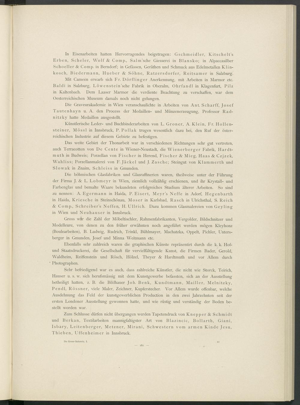 In Eisenarbeiten hatten Hervorragendes beigetragen: Gschmeidler, Kitschelt’s Erben, Scheler, Wolf & Comp., Salm’sche Giesserei in Blansko; in Alpaccasilber Schoeller & Comp, in Berndorf; in Gefässen, Geräthen und Schmuck aus Edelmetallen Klin- kosch, Biedermann, Hueber & Söhne, Ratzersdorfer, Reitsamer in Salzburg.