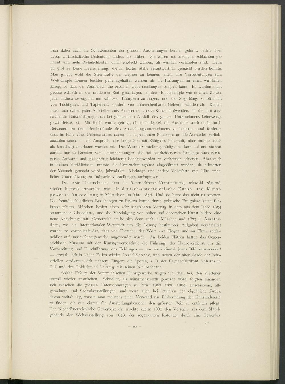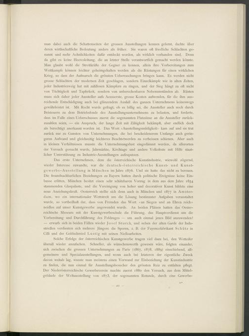 Das erste Unternehmen, dem die österreichische Kunstindustrie, wiewohl zögernd, wieder Interesse zuwandte, war die deutsch-österreichische Kunst- und Kunstgewerbe-Ausstellung in München im Jahre 1876. Und sie hatte das nicht zu bereuen. Die freundnachbarlichen Beziehungen zu Bayern hatten durch politische Ereignisse keine Einbusse erlitten, München besitzt einen sehr schätzbaren Vorzug in dem aus dem Jahre 1854 stammenden Glaspalaste, und die Vereinigung von hoher und decorativer Kunst bildete eine neue Anziehungskraft. Oesterreich stellte sich denn auch in München und 1877 in Amsterdam, wo ein internationaler Wettstreit um die Lösung bestimmter Aufgaben veranstaltet wurde, so vortheilhaft dar, dass von Fremden das Wort «an Siegen und an Ehren reich» neidlos auf unser Kunstgewerbe angewendet wurde. An beiden Plätzen hatten das Oester- reichische Museum mit der Kunstgewerbeschule die Führung, das Hauptverdienst um die Vorbereitung und Durchführung des Feldzuges — um auch einmal jenes Bild anzuwenden! — erwarb sich in beiden Fällen wieder Josef Storek, und neben der alten Garde der Industriellen verdienten sich mehrere Jüngere die Sporen, z. B. der Fayencefabrikant Schütz in Cilli und der Goldschmied Lustig mit seinen Nielloarbeiten.