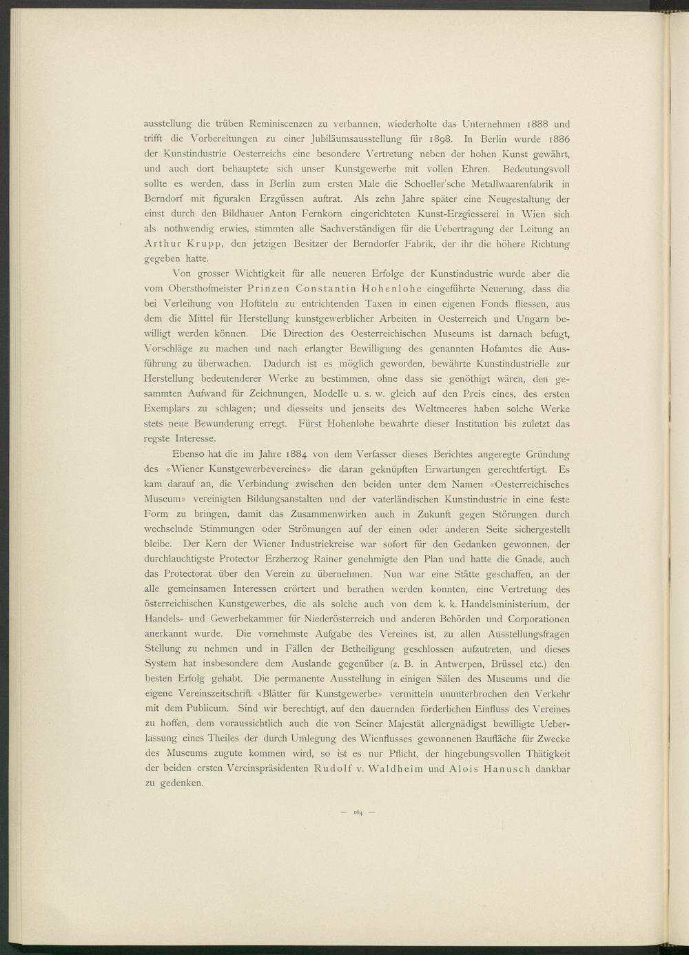 Ebenso hat die im Jahre 1884 von dem Verfasser dieses Berichtes angeregte Gründung des «Wiener Kunstgewerbevereines» die daran geknüpften Erwartungen gerechtfertigt. Es kam darauf an, die Verbindung zwischen den beiden unter dem Namen «Oesterreichisches Museum» vereinigten Bildungsanstalten und der vaterländischen Kunstindustrie in eine feste Form zu bringen, damit das Zusammenwirken auch in Zukunft gegen Störungen durch wechselnde Stimmungen oder Strömungen auf der einen oder anderen Seite sichergestellt bleibe. Der Kern der Wiener Industriekreise war sofort für den Gedanken gewonnen, der durchlauchtigste Protector Erzherzog Rainer genehmigte den Plan und hatte die Gnade, auch das Protectorat über den Verein zu übernehmen. Nun war eine Stätte geschaffen, an der alle gemeinsamen Interessen erörtert und berathen werden konnten, eine Vertretung des österreichischen Kunstgewerbes, die als solche auch von dem k. k. Handelsministerium, der Handels- und Gewerbekammer für Niederösterreich und anderen Behörden und Corporationen anerkannt wurde. Die vornehmste Aufgabe des Vereines ist, zu allen Ausstellungsfragen Stellung zu nehmen und in Fällen der Betheiligung geschlossen aufzutreten, und dieses System hat insbesondere dem Auslande gegenüber (z. B. in Antwerpen, Brüssel etc.) den besten Erfolg gehabt. Die permanente Ausstellung in einigen Sälen des Museums und die eigene Vereinszeitschrift «Blätter für Kunstgewerbe» vermitteln ununterbrochen den Verkehr mit dem Publicum. Sind wir berechtigt, auf den dauernden förderlichen Einfluss des Vereines zu hoffen, dem voraussichtlich auch die von Seiner Majestät allergnädigst bewilligte Ueber- lassung eines Theiles der durch Umlegung des Wienflusses gewonnenen Baufläche für Zwecke des Museums zugute kommen wird, so ist es nur Pflicht, der hingebungsvollen Thätigkeit der beiden ersten Vereinspräsidenten Rudolf v. Waldheim und Alois Hanusch dankbar zu gedenken.