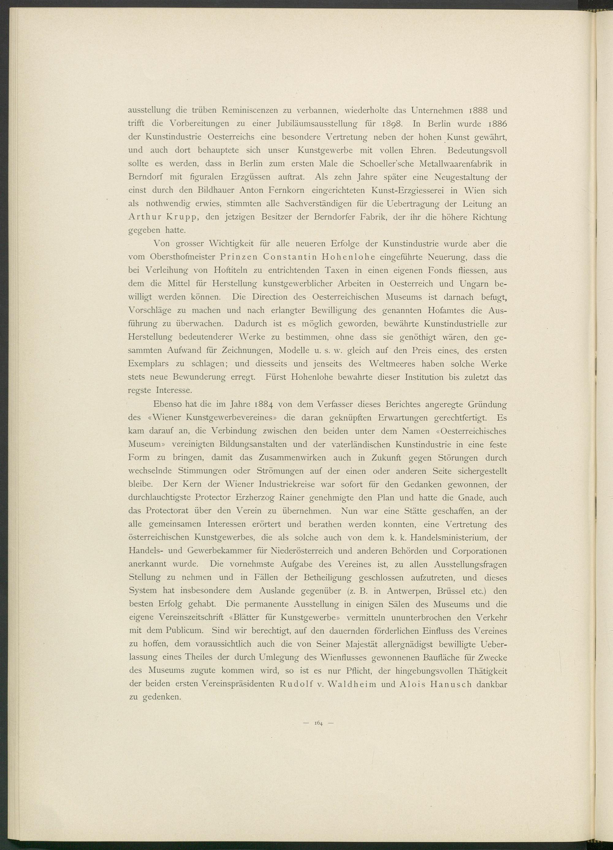 ausstellung die trüben Reminiscenzen zu verbannen, wiederholte das Unternehmen 1888 und trifft die Vorbereitungen zu einer Jubiläumsausstellung für 1898. In Berlin wurde 1886 der Kunstindustrie Oesterreichs eine besondere Vertretung neben der hohen Kunst gewährt, und auch dort behauptete sich unser Kunstgewerbe mit vollen Ehren. Bedeutungsvoll sollte es werden, dass in Berlin zum ersten Male die Schoeller’sche Metallwaarenfabrik in Berndorf mit figuralen Erzgüssen auftrat. Als zehn Jahre später eine Neugestaltung der einst durch den Bildhauer Anton Fernkorn eingerichteten Kunst-Erzgiesserei in Wien sich als nothwendig erwies, stimmten alle Sachverständigen für die Uebertragung der Leitung an Arthur Krupp, den jetzigen Besitzer der Berndorfer Fabrik, der ihr die höhere Richtung gegeben hatte.