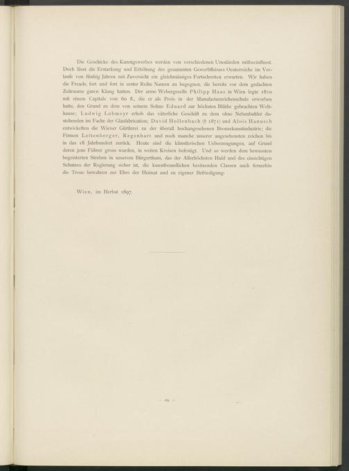 Die Geschicke des Kunstgewerbes werden von verschiedenen Umständen mitbeeinflusst. Doch lässt die Erstarkung und Erhöhung des gesammten Gewerbfleisses Oesterreichs im Verlaufe von fünfzig Jahren mit Zuversicht ein gleichmässiges Fortschreiten erwarten. Wir haben die Freude, fort und fort in erster Reihe Namen zu begegnen, die bereits vor dem gedachten Zeiträume guten Klang hatten. Der arme Webergeselle Philipp Haas in Wien legte 1810 mit einem Capitale von 60 fl., die er als Preis in der Manufacturzeichenschule erworben hatte, den Grund zu dem von seinem Sohne Eduard zur höchsten Blüthe gebrachten Welthause; Ludwig Lobmeyr erhob das väterliche Geschäft zu dem ohne Nebenbuhler dastehenden im Fache der Glasfabrication; David Hollenbach (f 1871) und Alois Hanusch entwickelten die Wiener Gürtlerei zu der überall hochangesehenen Bronzekunstindustrie; die Firmen Leitenberger, Regenhart und noch manche unserer angesehensten reichen bis in das 18. Jahrhundert zurück. Heute sind die künstlerischen Ueberzeugungen, auf Grund deren jene Führer gross wurden, in weiten Kreisen befestigt. Und so werden dem bewussten begeisterten Streben in unserem Bürgerthum, das der Allerhöchsten Huld und des einsichtigen Schutzes der Regierung sicher ist, die kunstfreundlichen besitzenden Classen auch fernerhin die Treue bewahren zur Ehre der Heimat und zu eigener Befriedigung.