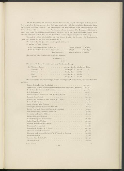Gegenwärtig stehen i 3 o Schächte mit rund 3 o.ooo Arbeitern im Betriebe. Die Production im Jahre 1897 beläuft sich auf über 160 Millionen M.-Ctr.