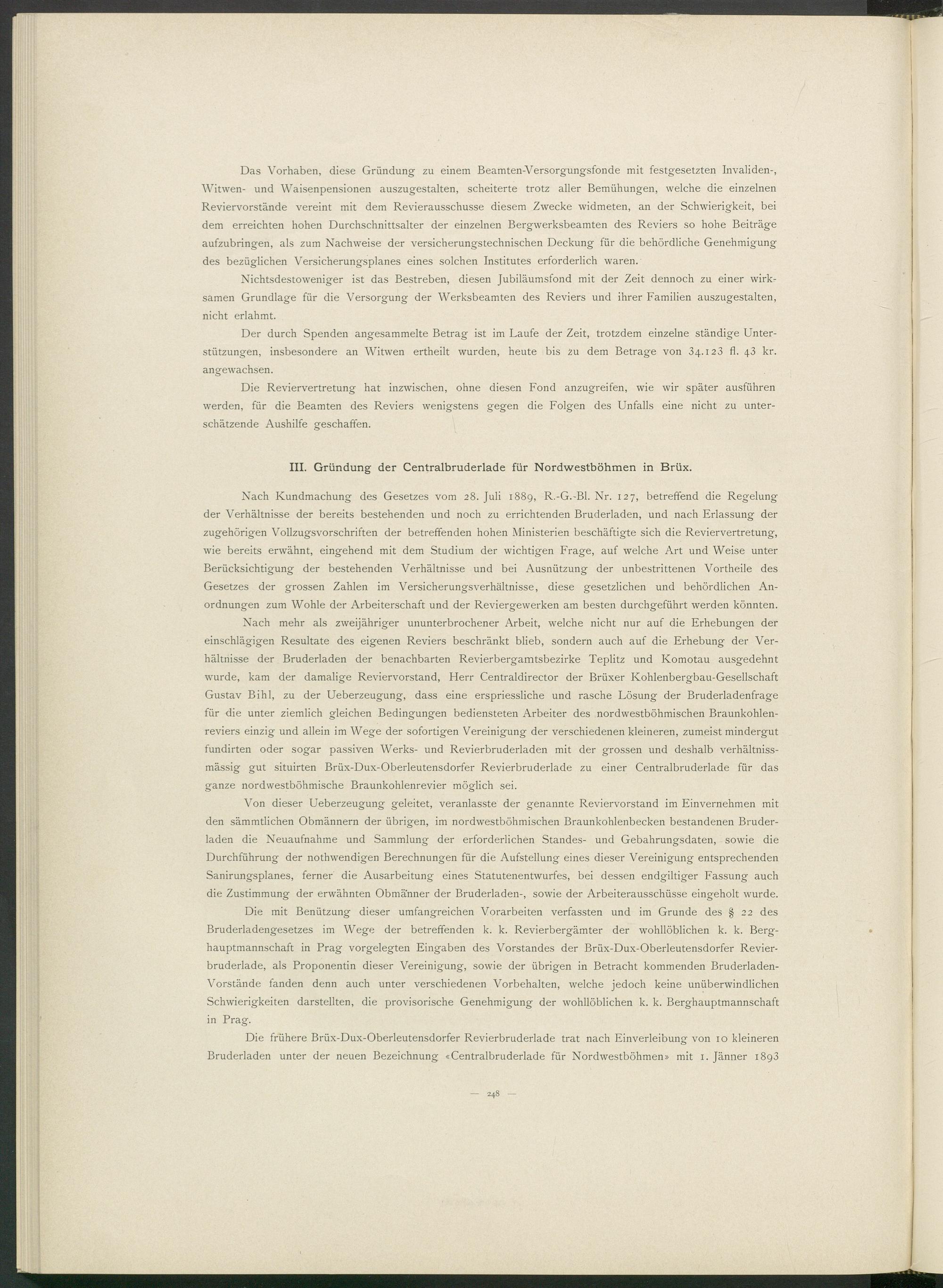 Nach mehr als zweijähriger ununterbrochener Arbeit, welche nicht nur auf die Erhebungen der einschlägigen Resultate des eigenen Reviers beschränkt blieb, sondern auch auf die Erhebung der Verhältnisse der Bruderladen der benachbarten Revierbergamtsbezirke Teplitz und Komotau ausgedehnt wurde, kam der damalige Reviervorstand, Herr Centraldirector der Brüxer Kohlenbergbau-Gesellschaft Gustav Bihl, zu der Ueberzeugung, dass eine erspriessliche und rasche Lösung der Bruderladenfrage für die unter ziemlich gleichen Bedingungen bediensteten Arbeiter des nordwestböhmischen Braunkohlenreviers einzig und allein im Wege der sofortigen Vereinigung der verschiedenen kleineren, zumeist mindergut fundirten oder sogar passiven Werks- und Revierbruderladen mit der grossen und deshalb verhältniss- mässig gut situirten Brüx-Dux-Oberleutensdorfer Revierbruderlade zu einer Centralbruderlade für das ganze nordwestböhmische Braunkohlenrevier möglich sei.