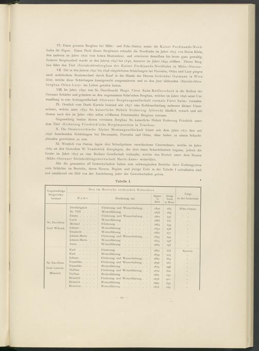 VII. Die in den Jahren 1842 bis 1848 eingeleiteten Schürfungen bei Poremba, Orlau und Lazy gingen nach mehrfachem Besitzwechsel durch Kauf in die Hände der Herren Gebrüder Gutmann in Wien über, welche diese Schürfungen kunstgerecht ausgestalteten und so den jetzt blühenden «Steinkohlenbergbau Orlau-Lazy» ins Leben gerufen haben.