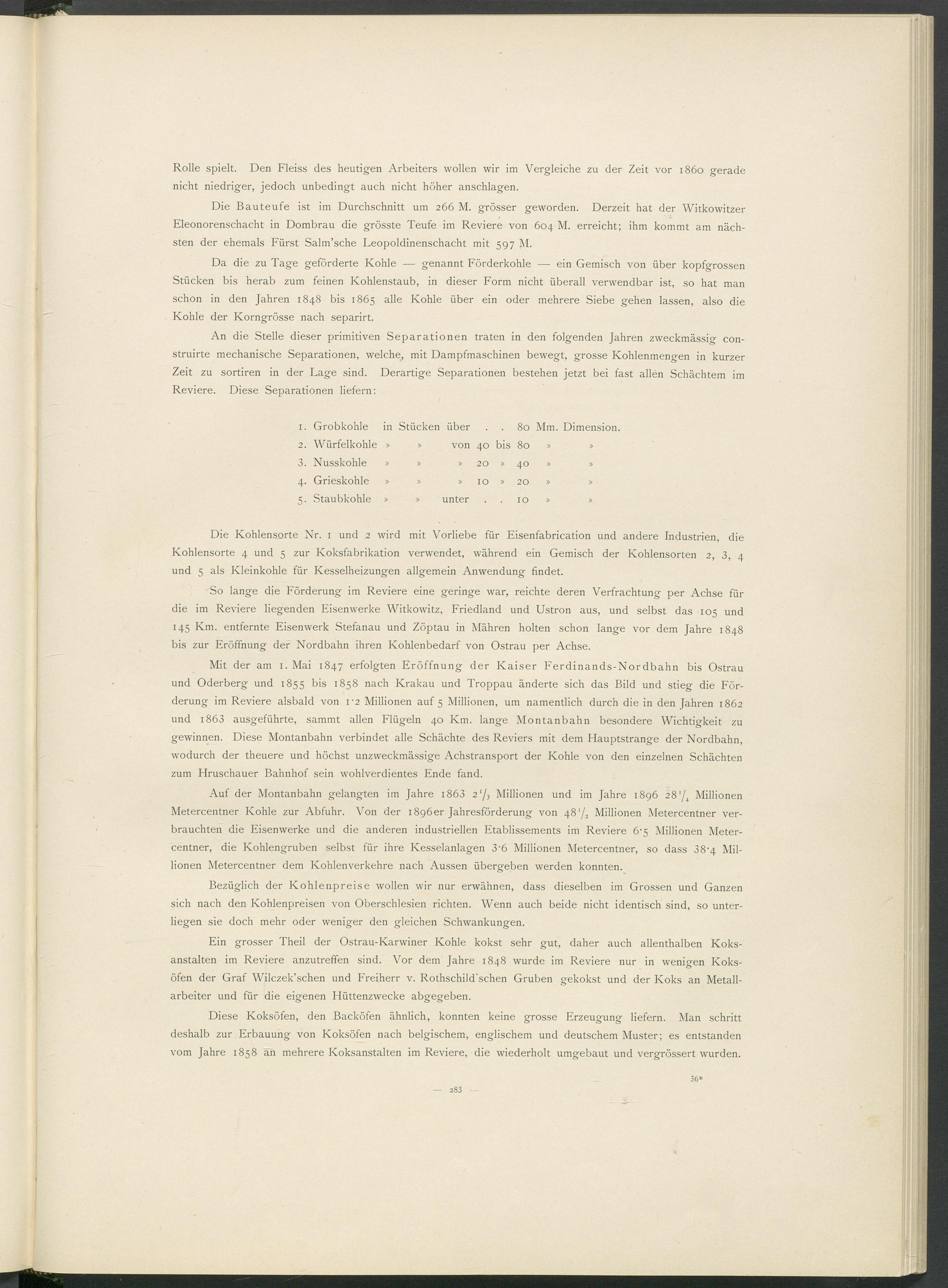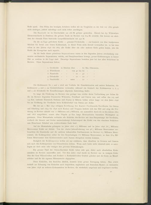 An die Stelle dieser primitiven Separationen traten in den folgenden Jahren zweckmässig con- struirte mechanische Separationen, welche, mit Dampfmaschinen bewegt, grosse Kohlenmengen in kurzer Zeit zu sortiren in der Lage sind. Derartige Separationen bestehen jetzt bei fast allen Schächtern im Reviere. Diese Separationen liefern: