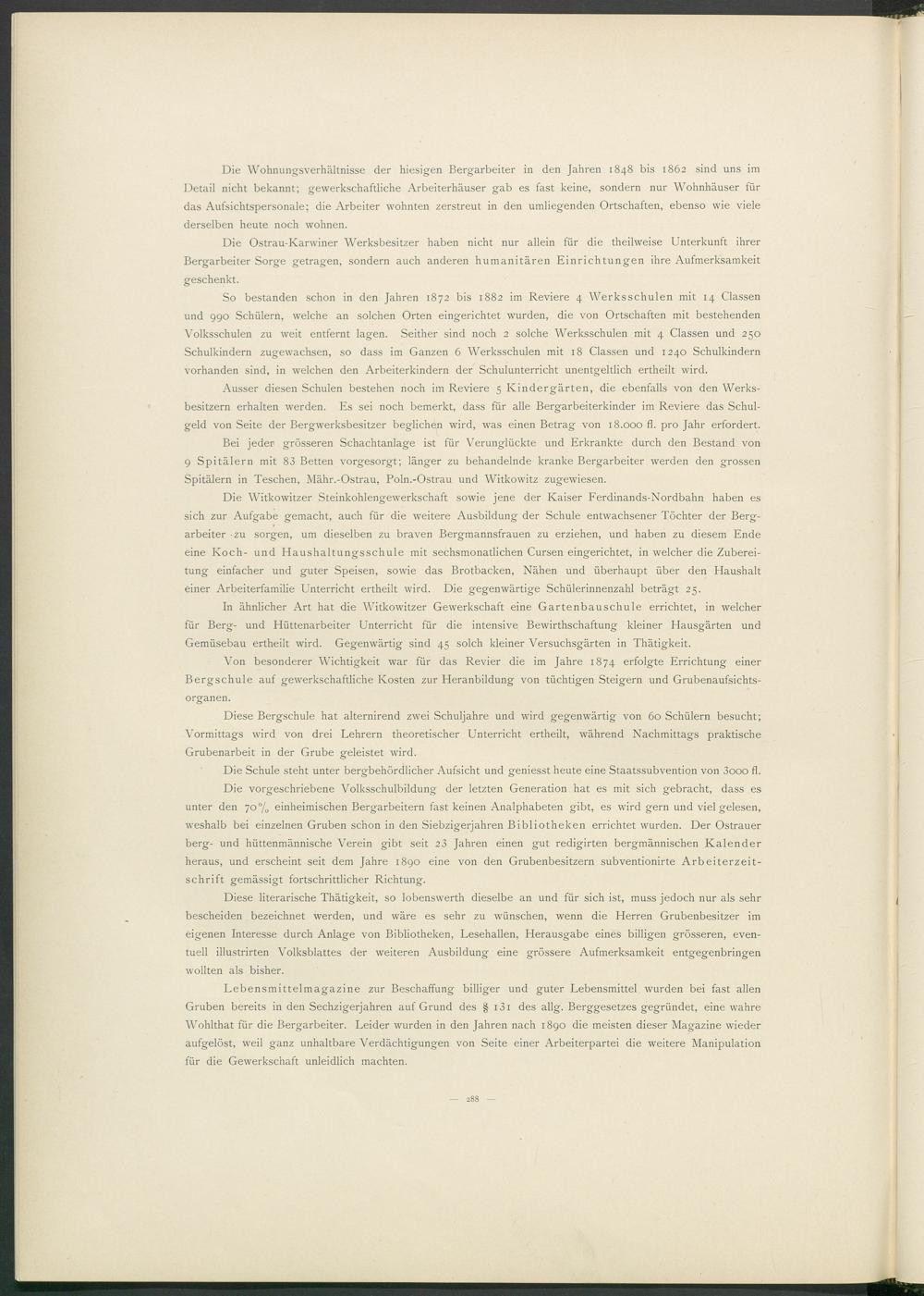 Lebensmittelmagazine zur Beschaffung billiger und guter Lebensmittel wurden bei fast allen Gruben bereits in den Sechzigerjahren auf Grund des § 1 3 1 des allg. Berggesetzes gegründet, eine wahre Wohlthat für die Bergarbeiter. Leider wurden in den Jahren nach 1890 die meisten dieser Magazine wieder aufgelöst, weil ganz unhaltbare Verdächtigungen von Seite einer Arbeiterpartei die weitere Manipulation für die Gewerkschaft unleidlich machten.