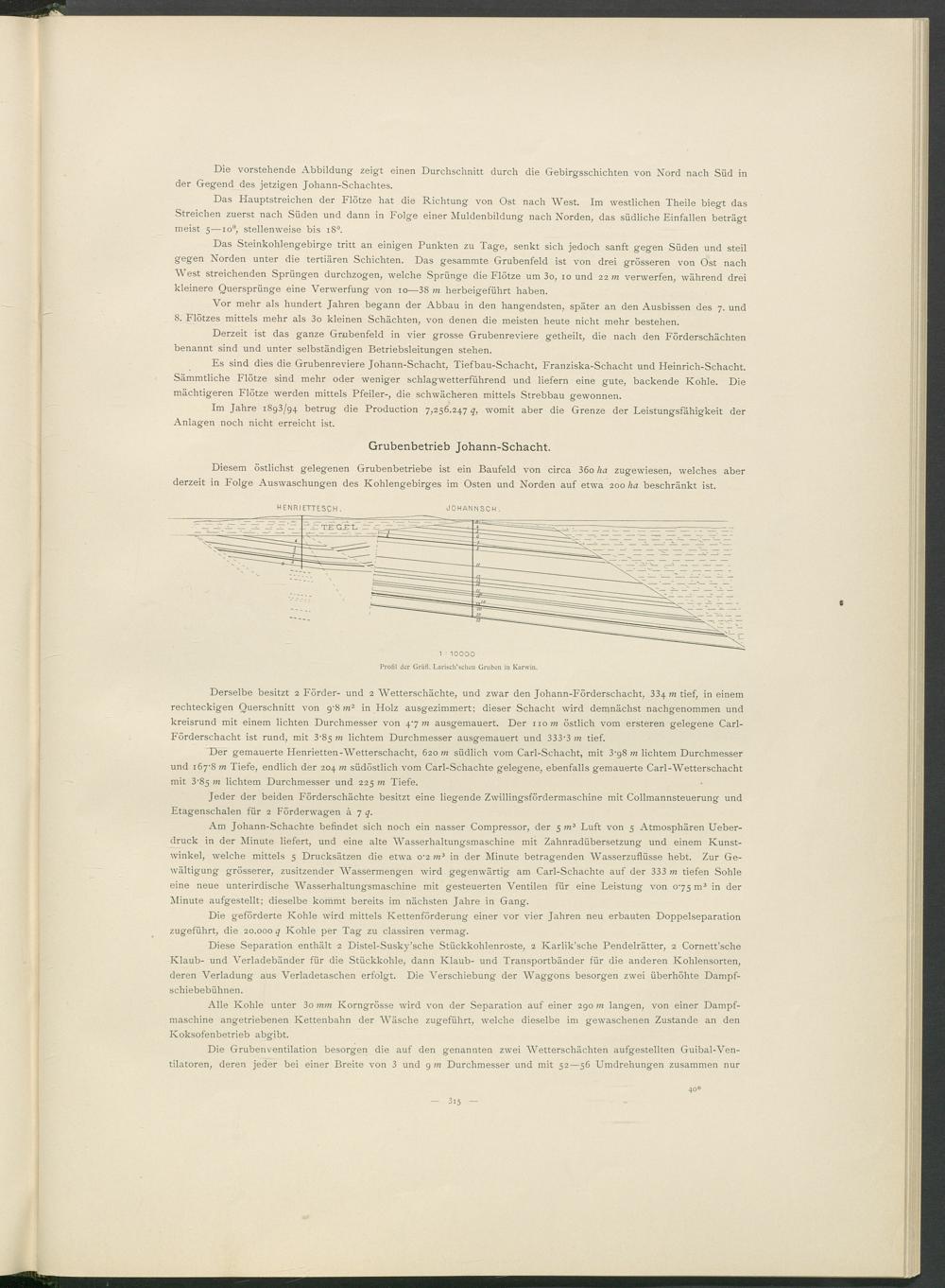 Derselbe besitzt 2 Förder- und 2 Wetterschächte, und zwar den Johann-Förderschacht, 334 m tief, in einem rechteckigen Querschnitt von g - 8 m 2 in Holz ausgezimmert; dieser Schacht wird demnächst nachgenommen und kreisrund mit einem lichten Durchmesser von 47 m ausgemauert. Der 110 m östlich vom ersteren gelegene Carl- Förderschacht ist rund, mit 3-85 m lichtem Durchmesser ausgemauert und 333*3 m tief.