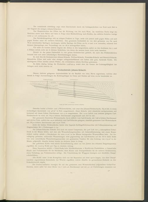 Es sind dies die Grubenreviere Johann-Schacht, Tiefbau-Schacht, Franziska-Schacht und Heinrich-Schacht. Sämmtliche Flötze sind mehr oder weniger schlagwetterführend und liefern eine gute, backende Kohle. Die mächtigeren Flötze werden mittels Pfeiler-, die schwächeren mittels Strebbau gewonnen.