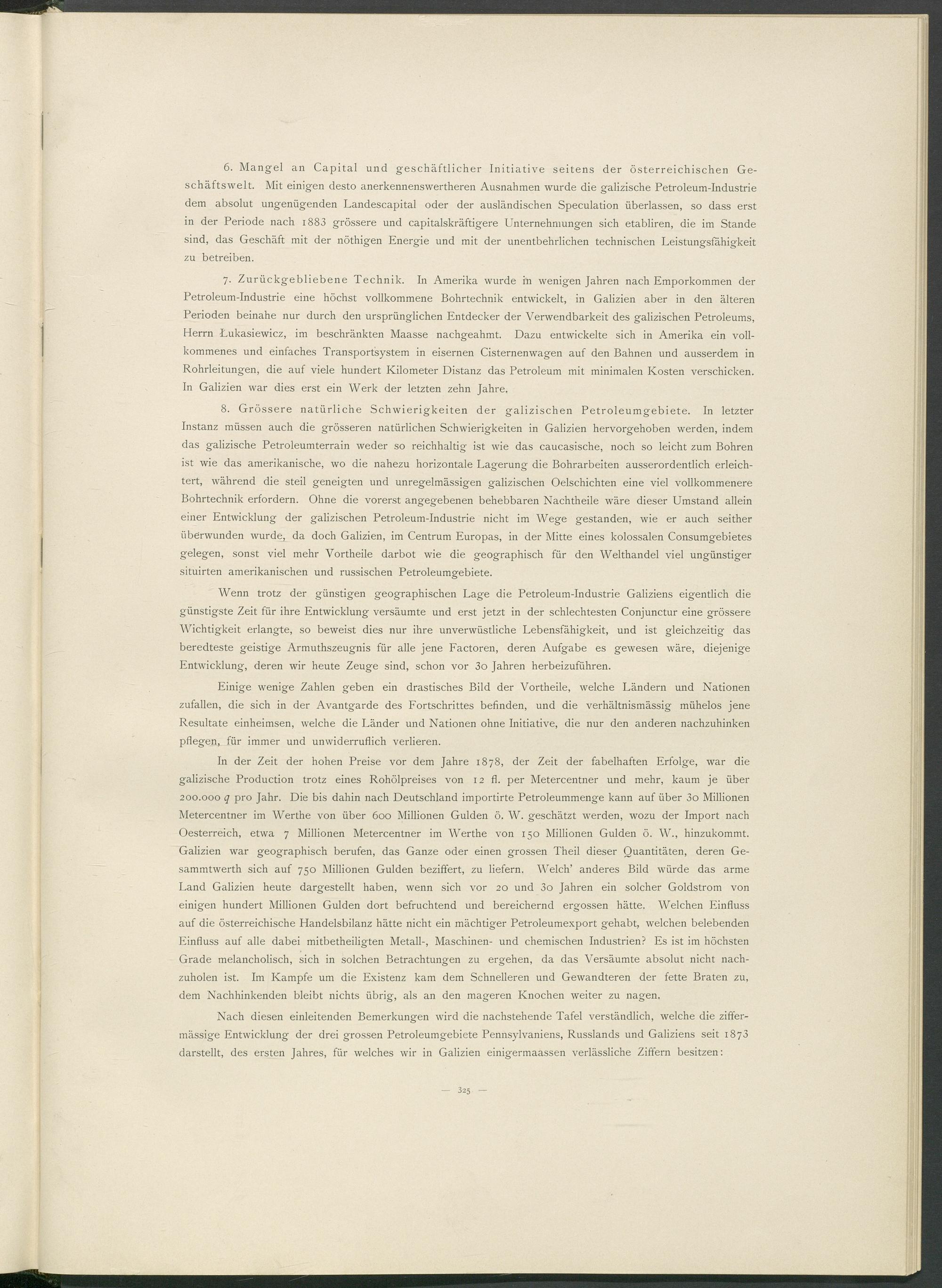 6. Mangel an Capital und geschäftlicher Initiative seitens der österreichischen Geschäftswelt. Mit einigen desto anerkennenswertheren Ausnahmen wurde die galizische Petroleum-Industrie dem absolut ungenügenden Landescapital oder der ausländischen Speculation überlassen, so dass erst in der Periode nach i883 grössere und capitalskräftigere Unternehmungen sich etabliren, die im Stande sind, das Geschäft mit der nöthigen Energie und mit der unentbehrlichen technischen Leistungsfähigkeit zu betreiben.