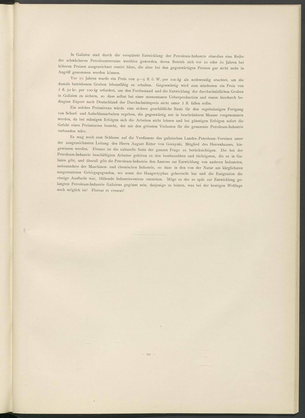 Es mag noch zum Schlüsse auf die Verdienste des galizischen Landes-Petroleum-Vereines unter der ausgezeichneten Leitung des Herrn August Ritter von Gorayski, Mitglied des Herrenhauses, hingewiesen werden. Ebenso ist die culturelle Seite der ganzen Frage zu berücksichtigen. Die bei der