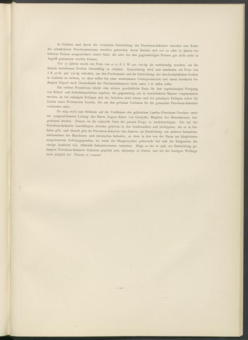 lizien gibt, und überall gibt die Petroleum-Industrie den Anstoss zur Entwicklung von anderen Industrien, insbesondere der Maschinen- und chemischen Industrie, so dass in den von der Natur am kärglichsten ausgestatteten Gebirgsgegenden, wo sonst der Hungertyphus geherrscht hat und die Emigration die einzige Ausflucht war, blühende Industriecentren entstehen. Möge es der so spät zur Entwicklung gelangten Petroleum-Industrie Galiziens gegönnt sein, dasjenige zu leisten, was bei der heutigen Weltlage noch möglich ist! Floreat et crescat!