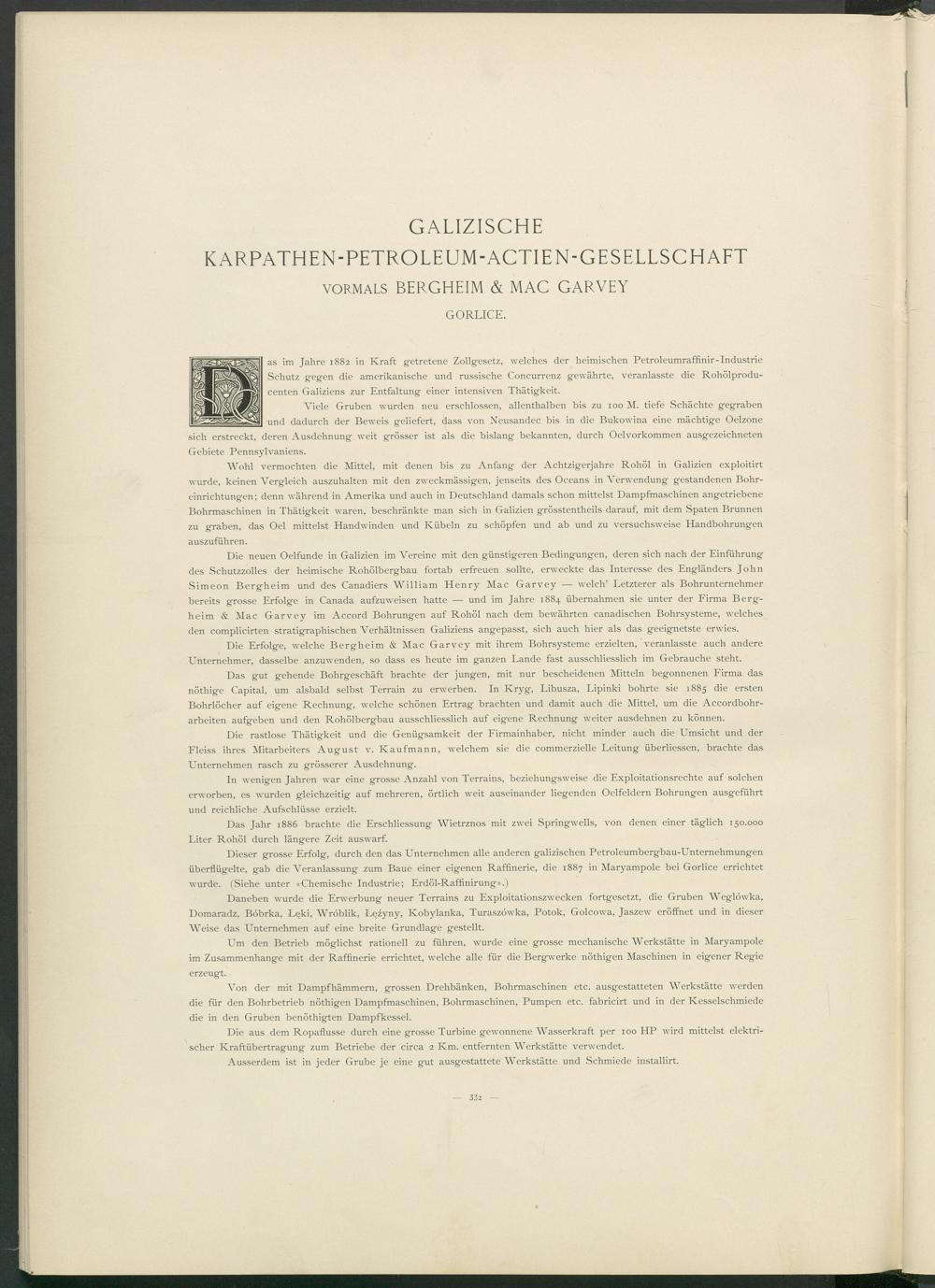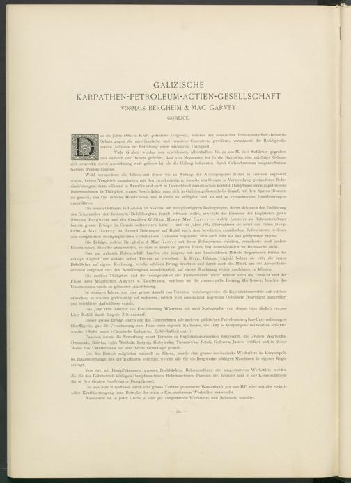 Die neuen Oelfunde in Galizien im Vereine mit den günstigeren Bedingungen, deren sich nach der Einführung des Schutzzolles der heimische Rohölbergbau fortab erfreuen sollte, erweckte das Interesse des Engländers John Simeon Bergheim und des Canadiers William Henry Mac Garvey — welch’ Letzterer als Bohrunternehmer bereits grosse Erfolge in Canada aufzuweisen hatte — und im Jahre 1884 übernahmen sie unter der Firma Bergheim & Mac Garvey im Accord Bohrungen auf Rohöl nach dem bewährten canadischen Bohrsysteme, welches den complicirten stratigraphischen Verhältnissen Galiziens angepasst, sich auch hier als das geeignetste erwies.
