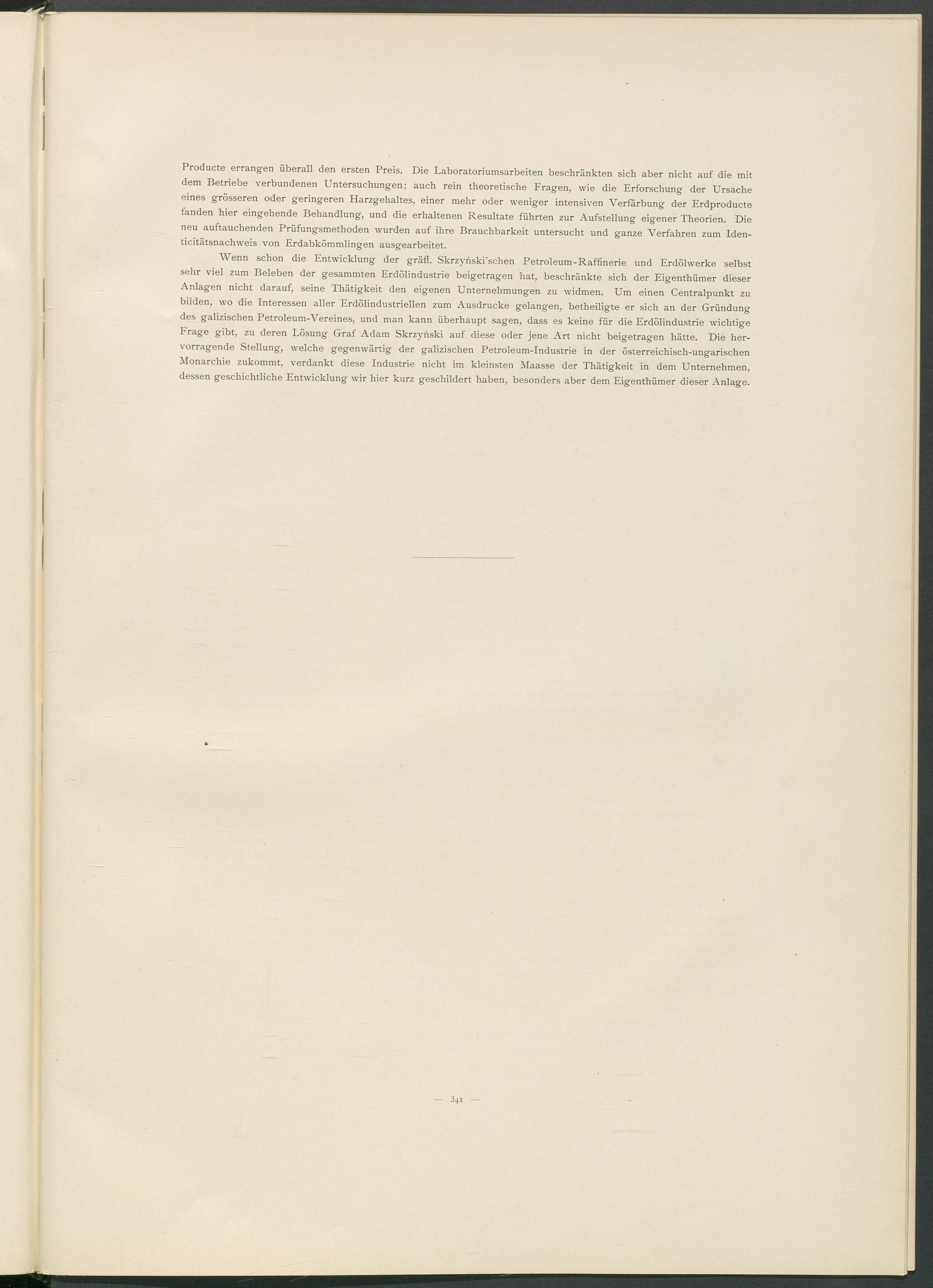 Wenn schon die Entwicklung der gräfl. Skrzynski’schen Petroleum-Raffinerie und Erdölwerke selbst sehr viel zum Beleben der gesammten Erdölindustrie beigetragen hat, beschränkte sich der Eigenthümer dieser Anlagen nicht darauf, seine Thätigkeit den eigenen Unternehmungen zu widmen. Um einen Centralpunkt zu bilden, wo die Interessen aller Erdölindustriellen zum Ausdrucke gelangen, betheiligte er sich an der Gründung des galizischen Petroleum-Vereines, und man kann überhaupt sagen, dass es keine für die Erdölindustrie wichtige Frage gibt, zu deren Lösung Graf Adam Skrzynski auf diese oder jene Art nicht beigetragen hätte. Die hervorragende Stellung, welche gegenwärtig der galizischen Petroleum-Industrie in der österreichisch-ungarischen Monarchie zukommt, verdankt diese Industrie nicht im kleinsten Maasse der Thätigkeit in dem Unternehmen, dessen geschichtliche Entwicklung wir hier kurz geschildert haben, besonders aber dem Eigenthümer dieser Anlage.