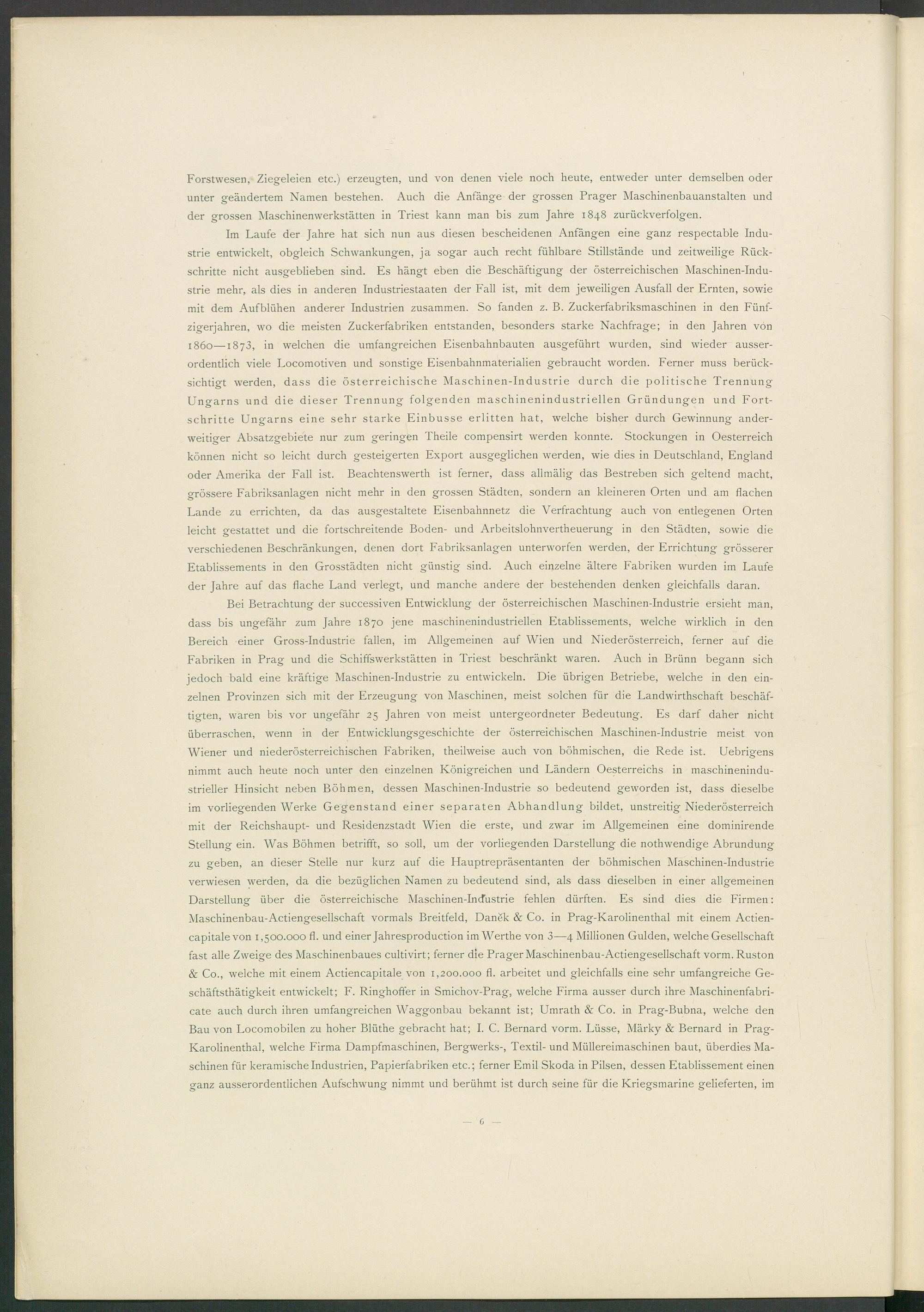 Bei Betrachtung der successiven Entwicklung der österreichischen Maschinen-Industrie ersieht man, dass bis ungefähr zum Jahre 1870 jene maschinenindustriellen Etablissements, welche wirklich in den Bereich einer Gross-Industrie fallen, im Allgemeinen auf Wien und Niederösterreich, ferner auf die Fabriken in Prag und die Schiffswerkstätten in Triest beschränkt waren. Auch in Brünn begann sich jedoch bald eine kräftige Maschinen-Industrie zu entwickeln. Die übrigen Betriebe, welche in den einzelnen Provinzen sich mit der Erzeugung von Maschinen, meist solchen für die Landwirthschaft beschäftigten, waren bis vor ungefähr 25 Jahren von meist untergeordneter Bedeutung. Es darf daher nicht überraschen, wenn in der Entwicklungsgeschichte der österreichischen Maschinen-Industrie meist von Wiener und niederösterreichischen Fabriken, theilweise auch von böhmischen, die Rede ist. Uebrigens nimmt auch heute noch unter den einzelnen Königreichen und Ländern Oesterreichs in maschinenindustrieller Hinsicht neben Böhmen, dessen Maschinen-Industrie so bedeutend geworden ist, dass dieselbe im vorliegenden Werke Gegenstand einer separaten Abhandlung bildet, unstreitig Niederösterreich mit der Reichshaupt- und Residenzstadt Wien die erste, und zwar im Allgemeinen eine dominirende Stellung ein. Was Böhmen betrifft, so soll, um der vorliegenden Darstellung die nothwendige Abrundung zu geben, an dieser Stelle nur kurz auf die Hauptrepräsentanten der böhmischen Maschinen-Industrie verwiesen werden, da die bezüglichen Namen zu bedeutend sind, als dass dieselben in einer allgemeinen Darstellung über die österreichische Maschinen-Industrie fehlen dürften. Es sind dies die Firmen: Maschinenbau-Actiengesellschaft vormals Breitfeld, Danek & Co. in Prag-Karolinenthal mit einem Actien- capitalevon 1,500.000 fl. und einer Jahresproduction im Werthe von 3—4 Millionen Gulden, welche Gesellschaft fast alle Zweige des Maschinenbaues cultivirt; ferner die Prager Maschinenbau-Actiengesellschaft vorm. Ruston & Co., welche mit einem Actiencapitale von 1,200.000 fl. arbeitet und gleichfalls eine sehr umfangreiche Ge- schäftsthätigkeit entwickelt; F. Ringhoffer in Smichov-Prag, welche Firma ausser durch ihre Maschinenfabri- cate auch durch ihren umfangreichen Waggonbau bekannt ist; Umrath & Co. in Prag-Bubna, welche den Bau von Locomobilen zu hoher Blüthe gebracht hat; I. C. Bernard vorm. Lüsse, Märky & Bernard in Prag- Karolinenthal, welche Firma Dampfmaschinen, Bergwerks-, Textil- und Müllereimaschinen baut, überdies Maschinen für keramische Industrien, Papierfabriken etc.; ferner Emil Skoda in Pilsen, dessen Etablissement einen ganz ausserordentlichen Aufschwung nimmt und berühmt ist durch seine für die Kriegsmarine gelieferten, im
