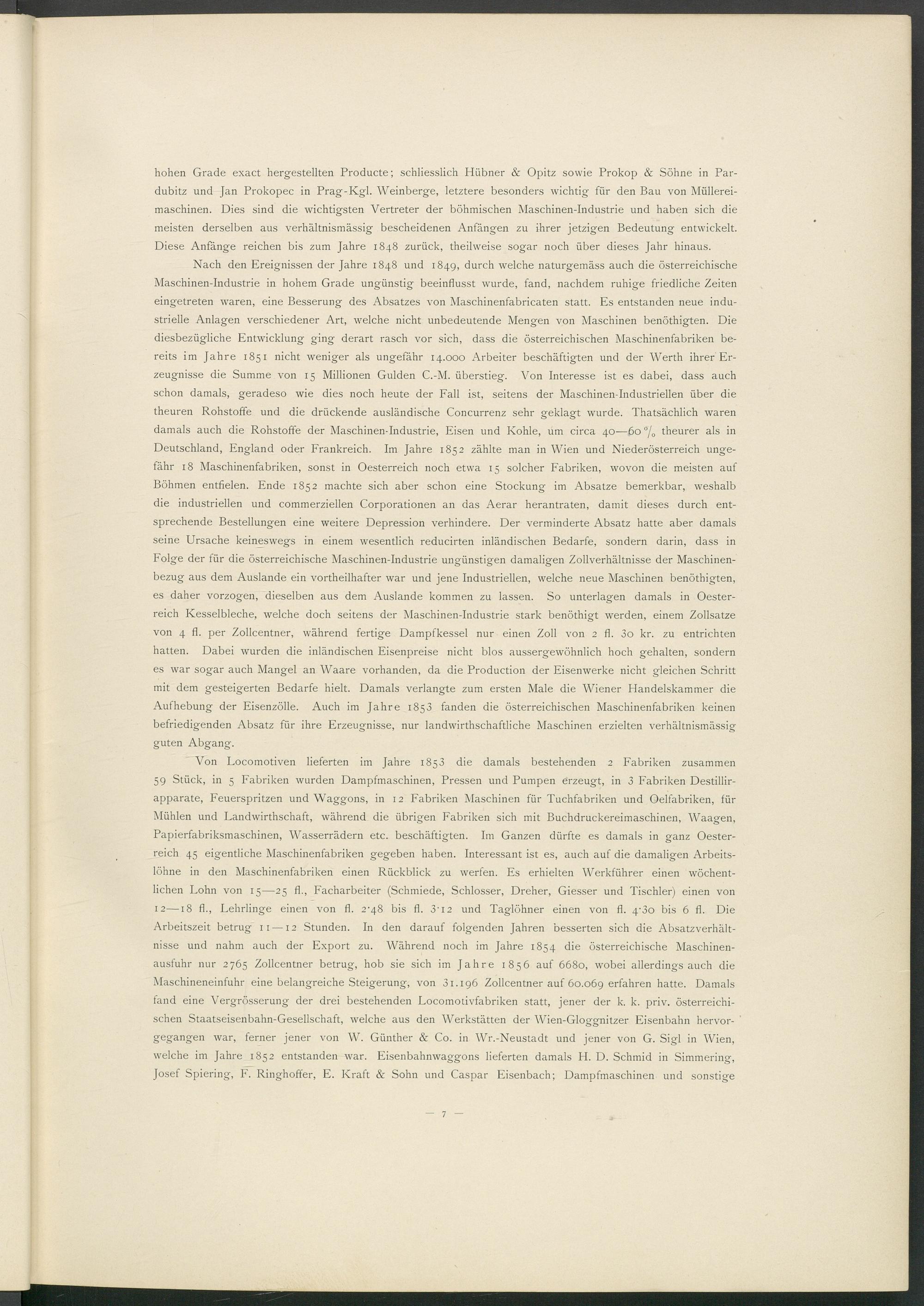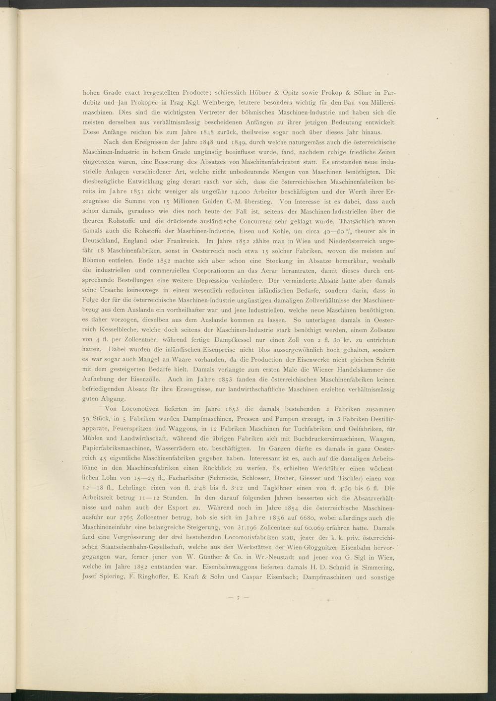 hohen Grade exact hergestellten Producte; schliesslich Hübner & Opitz sowie Prokop & Söhne in Pardubitz und Jan Prokopec in Prag-Kgl. Weinberge, letztere besonders wichtig für den Bau von Müllereimaschinen. Dies sind die wichtigsten Vertreter der böhmischen Maschinen-Industrie und haben sich die meisten derselben aus verhältnismässig bescheidenen Anfängen zu ihrer jetzigen Bedeutung entwickelt. Diese Anfänge reichen bis zum Jahre 1848 zurück, theilweise sogar noch über dieses Jahr hinaus.