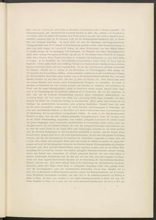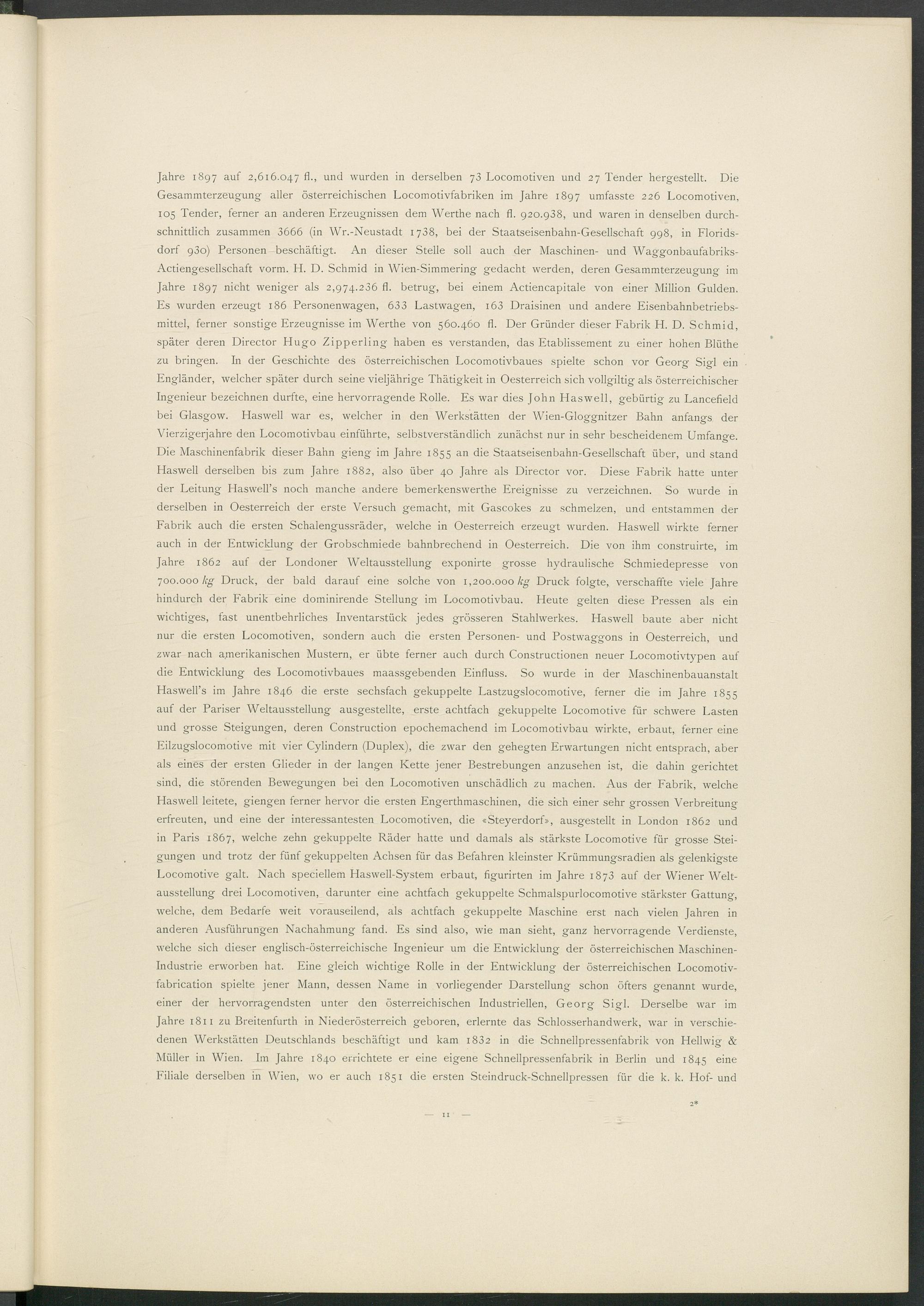 Jahre 1897 auf 2,616.047 fl., und wurden in derselben 73 Locomotiven und 27 Tender hergestellt. Die Gesammterzeugung aller österreichischen Locomotivfabriken im Jahre 1897 umfasste 226 Locomotiven, 105 Tender, ferner an anderen Erzeugnissen dem Werthe nach fl. 920.938, und waren in denselben durchschnittlich zusammen 3666 (in Wr.-Neustadt 1738, bei der Staatseisenbahn-Gesellschaft 998, in Floridsdorf 930) Personen beschäftigt. An dieser Stelle soll auch der Maschinen- und Waggonbaufabriks- Actiengesellschaft vorm. H. D. Schmid in Wien-Simmering gedacht werden, deren Gesammterzeugung im Jahre 1897 nicht weniger als 2,974.236 fl. betrug, bei einem Actiencapitale von einer Million Gulden. Es wurden erzeugt 186 Personenwagen, 633 Lastwagen, i63 Draisinen und andere Eisenbahnbetriebsmittel, ferner sonstige Erzeugnisse im Werthe von 560.460 fl. Der Gründer dieser Fabrik H. D. Schmid, später deren Director Hugo Zipperling haben es verstanden, das Etablissement zu einer hohen Blüthe zu bringen. In der Geschichte des österreichischen Locomotivbaues spielte schon vor Georg Sigl ein Engländer, welcher später durch seine vieljährige Thätigkeit in Oesterreich sich vollgiltig als österreichischer Ingenieur bezeichnen durfte, eine hervorragende Rolle. Es war dies John Haswell, gebürtig zu Lancefield bei Glasgow. Haswell war es, welcher in den Werkstätten der Wien-Gloggnitzer Bahn anfangs der Vierzigerjahre den Locomotivbau einführte, selbstverständlich zunächst nur in sehr bescheidenem Umfange. Die Maschinenfabrik dieser Bahn gieng im Jahre 1855 an die Staatseisenbahn-Gesellschaft über, und stand Haswell derselben bis zum Jahre 1882, also über 40 Jahre als Director vor. Diese Fabrik hatte unter der Leitung Haswell’s noch manche andere bemerkenswerthe Ereignisse zu verzeichnen. So wurde in derselben in Oesterreich der erste Versuch gemacht, mit Gascokes zu schmelzen, und entstammen der Fabrik auch die ersten Schalengussräder, welche in Oesterreich erzeugt wurden. Haswell wirkte ferner auch in der Entwicklung der Grobschmiede bahnbrechend in Oesterreich. Die von ihm construirte, im Jahre 1862 auf der Londoner Weltausstellung exponirte grosse hydraulische Schmiedepresse von 700.000 kg Druck, der bald darauf eine solche von 1,200.000 kg Druck folgte, verschaffte viele Jahre hindurch der Fabrik eine dominirende Stellung im Locomotivbau. Heute gelten diese Pressen als ein wichtiges, fast unentbehrliches Inventarstück jedes grösseren Stahlwerkes. Haswell baute aber nicht nur die ersten Locomotiven, sondern auch die ersten Personen- und Postwaggons in Oesterreich, und zwar nach amerikanischen Mustern, er übte ferner auch durch Constructionen neuer Locomotivtypen auf die Entwicklung des Locomotivbaues maassgebenden Einfluss. So wurde in der Maschinenbauanstalt Haswell’s im Jahre 1846 die erste sechsfach gekuppelte Lastzugslocomotive, ferner die im Jahre 1855 auf der Pariser Weltausstellung ausgestellte, erste achtfach gekuppelte Locomotive für schwere Lasten und grosse Steigungen, deren Construction epochemachend im Locomotivbau wirkte, erbaut, ferner eine Eilzugslocomotive mit vier Cylindern (Duplex), die zwar den gehegten Erwartungen nicht entsprach, aber als eines der ersten Glieder in der langen Kette jener Bestrebungen anzusehen ist, die dahin gerichtet sind, die störenden Bewegungen bei den Locomotiven unschädlich zu machen. Aus der Fabrik, welche Haswell leitete, giengen ferner hervor die ersten Engerthmaschinen, die sich einer sehr grossen Verbreitung erfreuten, und eine der interessantesten Locomotiven, die «Steyerdorf», ausgestellt in London 1862 und in Paris 1867, welche zehn gekuppelte Räder hatte und damals als stärkste Locomotive für grosse Steigungen und trotz der fünf gekuppelten Achsen für das Befahren kleinster Krümmungsradien als gelenkigste Locomotive galt. Nach speciellem Haswell-System erbaut, figurirten im Jahre 1873 auf der Wiener Weltausstellung drei Locomotiven, darunter eine achtfach gekuppelte Schmalspurlocomotive stärkster Gattung, welche, dem Bedarfe weit vorauseilend, als achtfach gekuppelte Maschine erst nach vielen Jahren in anderen Ausführungen Nachahmung fand. Es sind also, wie man sieht, ganz hervorragende Verdienste, welche sich dieser englisch-österreichische Ingenieur um die Entwicklung der österreichischen Maschinenindustrie erworben hat. Eine gleich wichtige Rolle in der Entwicklung der österreichischen Locomotiv- fabrication spielte jener Mann, dessen Name in vorliegender Darstellung schon öfters genannt wurde, einer der hervorragendsten unter den österreichischen Industriellen, Georg Sigl. Derselbe war im Jahre 1811 zu Breitenfurth in Niederösterreich geboren, erlernte das Schlosserhandwerk, war in verschiedenen Werkstätten Deutschlands beschäftigt und kam i 832 in die Schnellpressenfabrik von Hellwig & Müller in Wien. Im Jahre 1840 errichtete er eine eigene Schnellpressenfabrik in Berlin und 1845 e ” ie Filiale derselben in Wien, wo er auch 1851 die ersten Steindruck-Schnellpressen für die k. k. Hof- und