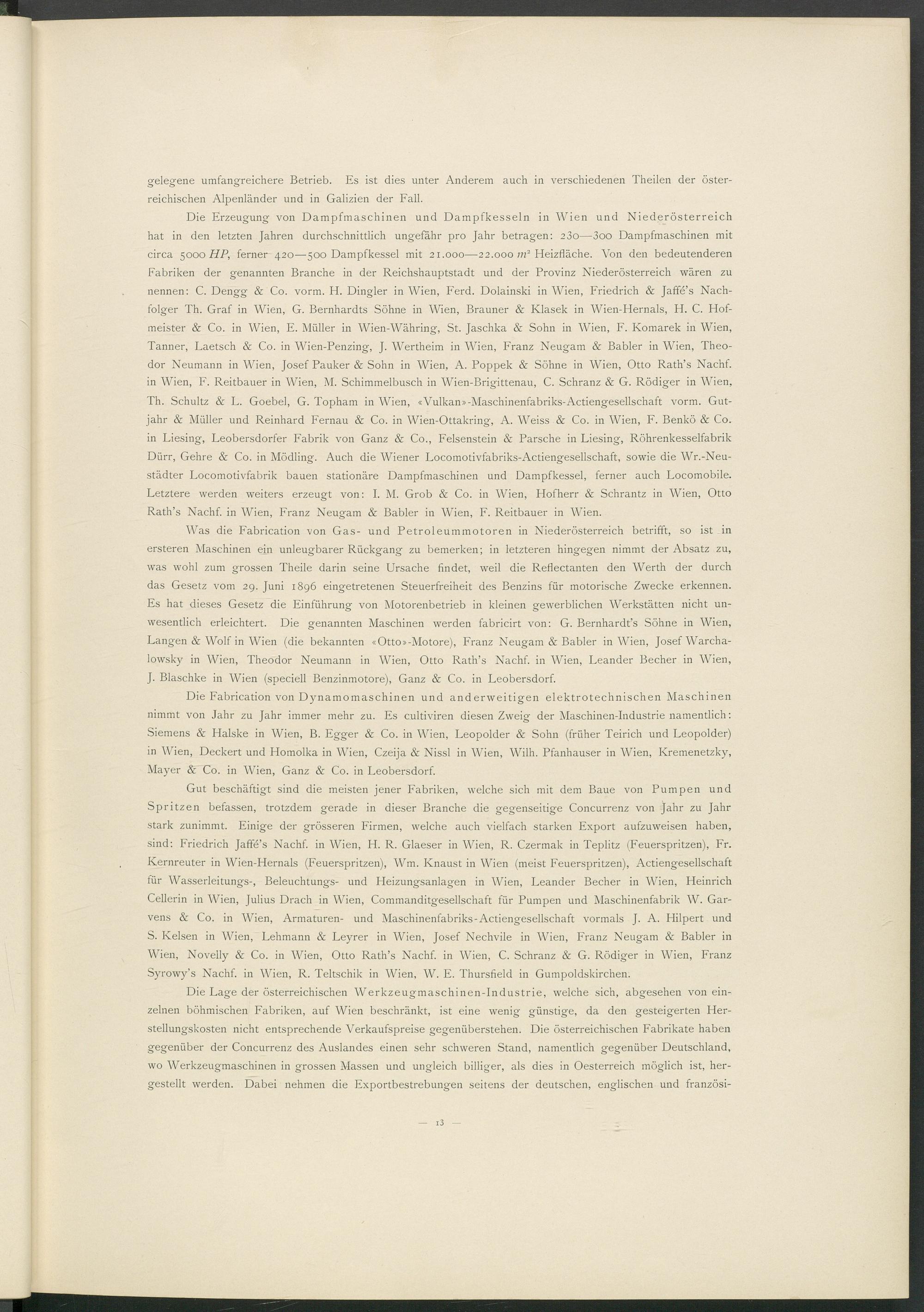 Die Erzeugung von Dampfmaschinen und Dampfkesseln in Wien und Niederösterreich hat in den letzten Jahren durchschnittlich ungefähr pro Jahr betragen: z3o—3oo Dampfmaschinen mit circa 5000 HP, ferner 420—500 Dampfkessel mit 21.000—22.000 77z 2 Heizfläche. Von den bedeutenderen Fabriken der genannten Branche in der Reichshauptstadt und der Provinz Niederösterreich wären zu nennen: C. Dengg & Co. vorm. H. Dingler in Wien, Ferd. Dolainski in Wien, Friedrich & Jaffe’s Nachfolger Th. Graf in Wien, G. Bernhardts Söhne in Wien, Brauner & Klasek in Wien-Hernals, H. C. Hofmeister & Co. in Wien, E. Müller in Wien-Währing, St. Jaschka & Sohn in Wien, F. Komarek in Wien, Tanner, Laetsch & Co. in Wien-Penzing, J. Wertheim in Wien, Franz Neugam & Babler in Wien, Theodor Neumann in Wien, Josef Pauker & Sohn in Wien, A. Poppek & Söhne in Wien, Otto Rath’s Nachf. in Wien, F. Reitbauer in Wien, M. Schimmelbusch in Wien-Brigittenau, C. Schranz & G. Rödiger in Wien, Th. Schultz & L. Goebel, G. Topham in Wien, «Vulkan»-Maschinenfabriks-Actiengesellschaft vorm. Gutjahr & Müller und Reinhard Fernau & Co. in Wien-Ottakring, A. Weiss & Co. in Wien, F. Benkö & Co. in Liesing, Leobersdorfer Fabrik von Ganz & Co., Felsenstein & Parsche in Liesing, Röhrenkesselfabrik Dürr, Gehre & Co. in Mödling. Auch die Wiener Locomotivfabriks-Actiengesellschaft, sowie die Wr.-Neustädter Locomotivfabrik bauen stationäre Dampfmaschinen und Dampfkessel, ferner auch Locomobile. Letztere werden weiters erzeugt von: I. M. Grob & Co. in Wien, Hofherr & Schrantz in Wien, Otto Rath’s Nachf. in Wien, Franz Neugam & Babler in Wien, F. Reitbauer in Wien.