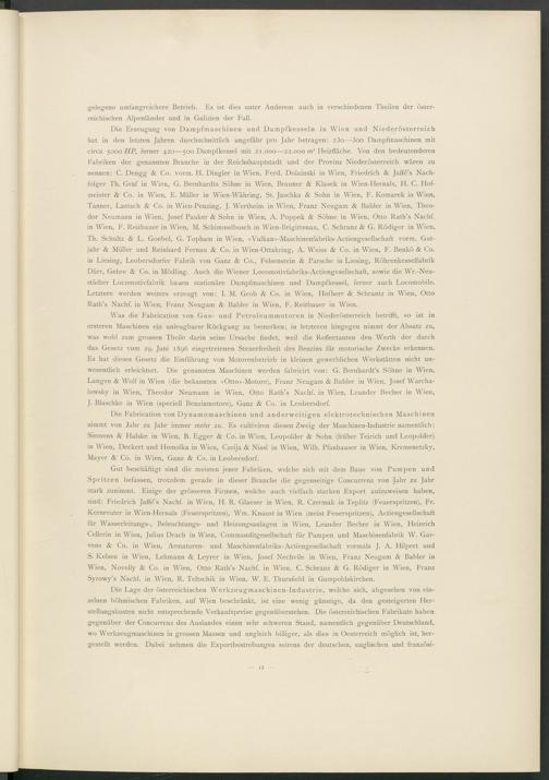 Was die Fabrication von Gas- und Petroleummotoren in Niederösterreich betrifft, so ist in ersteren Maschinen ein unleugbarer Rückgang zu bemerken; in letzteren hingegen nimmt der Absatz zu, was wohl zum grossen Theile darin seine Ursache findet, weil die Reflectanten den Werth der durch das Gesetz vom 29. Juni 1896 eingetretenen Steuerfreiheit des Benzins für motorische Zwecke erkennen. Es hat dieses Gesetz die Einführung von Motorenbetrieb in kleinen gewerblichen Werkstätten nicht un- wesentlich erleichtert. Die genannten Maschinen werden fabricirt von: G. Bernhardts Söhne in Wien, Langen & Wolf in Wien (die bekannten «Otto»-Motore), Franz Neugam & Babler in Wien, Josef Warcha- lowsky in Wien, Theodor Neumann in Wien, Otto Rath’s Nachf. in Wien, Leander Becher in Wien, J. Blaschke in Wien (speciell Benzinmotore), Ganz & Co. in Leobersdorf.
