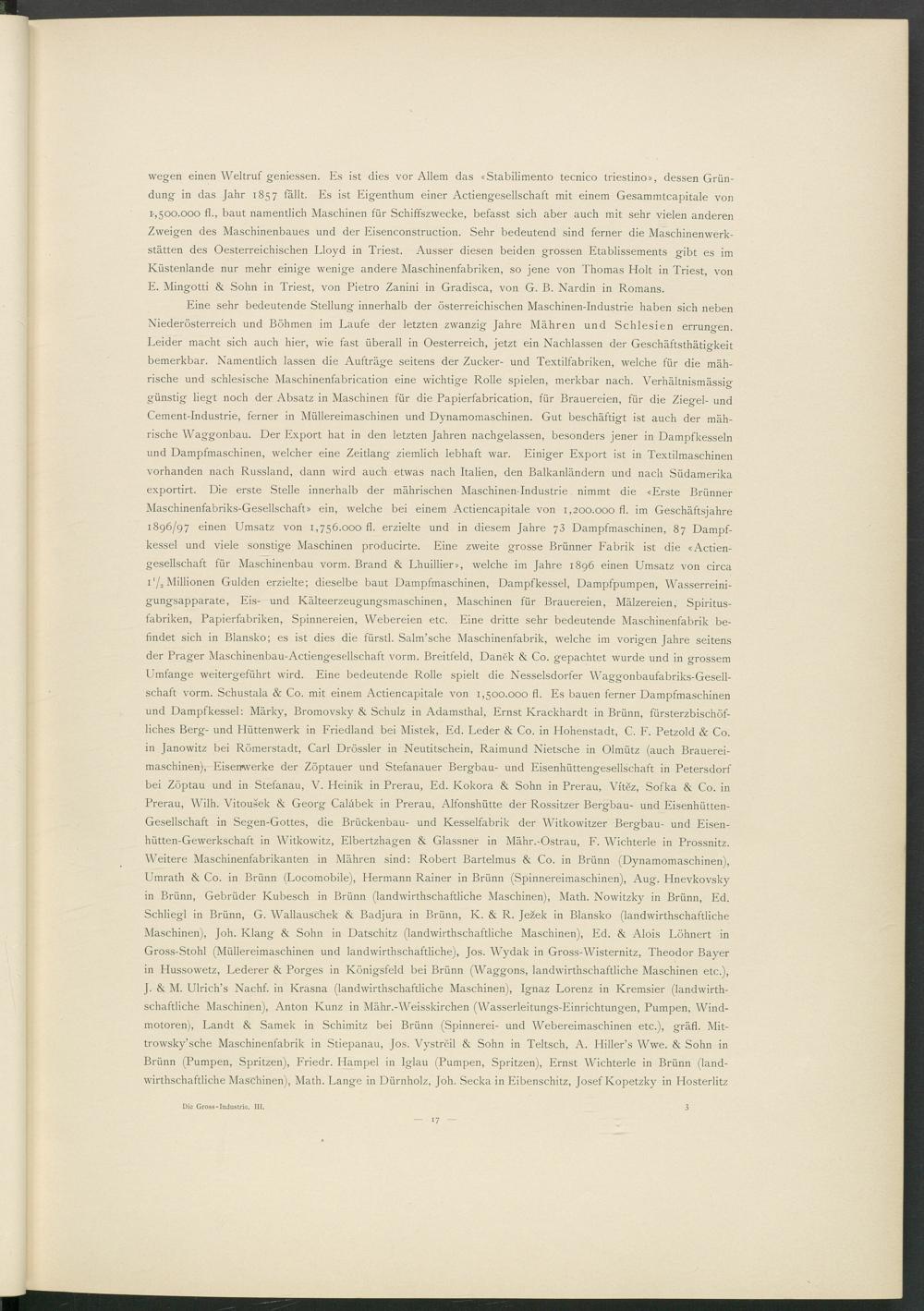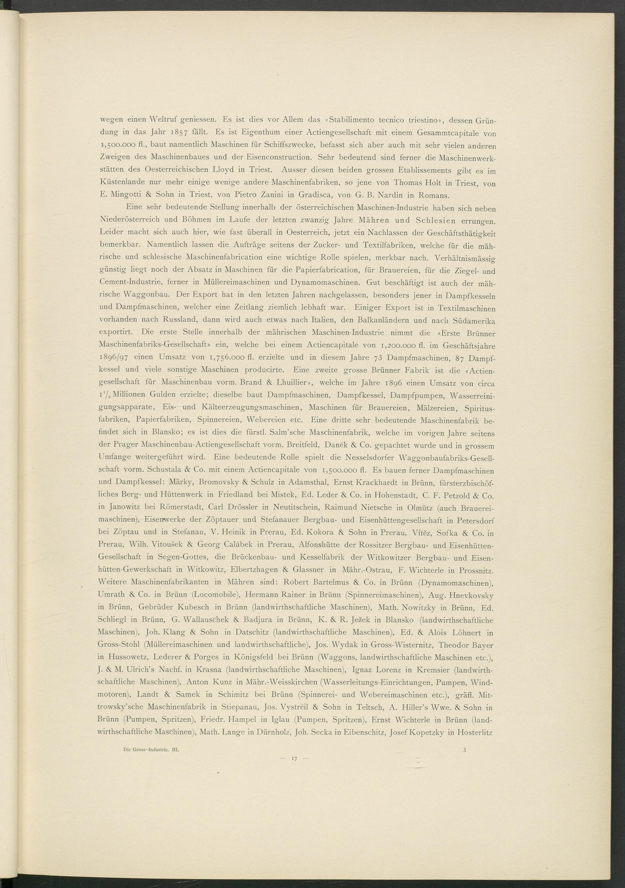 wegen einen Weltruf gemessen. Es ist dies vor Allem das «Stabilimento tecnico triestino», dessen Gründung in das Jahr 1857 fällt. Es ist Eigenthum einer Actiengesellschaft mit einem Gesammtcapitale von 1-,500.000 fl., baut namentlich Maschinen für Schiffszwecke, befasst sich aber auch mit sehr vielen anderen Zweigen des Maschinenbaues und der Eisenconstruction. Sehr bedeutend sind ferner die Maschinenwerkstätten des Oesterreichischen Lloyd in Triest. Ausser diesen beiden grossen Etablissements gibt es im Küstenlande nur mehr einige wenige andere Maschinenfabriken, so jene von Thomas Holt in Triest, von E. Mingotti & Sohn in Triest, von Pietro Zanini in Gradisca, von G. B. Nardin in Romans.