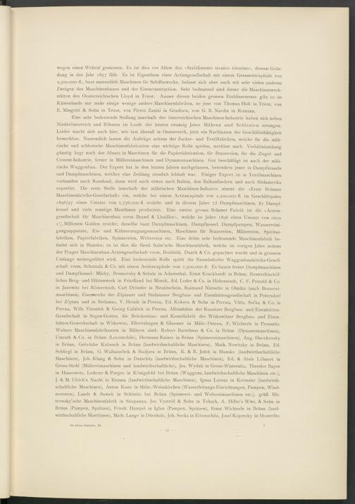 Eine sehr bedeutende Stellung innerhalb der österreichischen Maschinen-Industrie haben sich neben Niederösterreich und Böhmen im Laufe der letzten zwanzig Jahre Mähren und Schlesien errungen. Leider macht sich auch hier, wie fast überall in Oesterreich, jetzt ein Nachlassen der Geschäftsthätigkeit bemerkbar. Namentlich lassen die Aufträge seitens der Zucker- und Textilfabriken, welche für die mährische und schlesische Maschinenfabrication eine wichtige Rolle spielen, merkbar nach. Verhältnismässig günstig liegt noch der Absatz in Maschinen für die Papierfabrication, für Brauereien, für die Ziegel- und Cement-Industrie, ferner in Müllereimaschinen und Dynamomaschinen. Gut beschäftigt ist auch der mährische Waggonbau. Der Export hat in den letzten Jahren nachgelassen, besonders jener in Dampfkesseln und Dampfmaschinen, welcher eine Zeitlang ziemlich lebhaft war. Einiger Export ist in Textilmaschinen vorhanden nach Russland, dann wird auch etwas nach Italien, den Balkanländern und nach Südamerika exportirt. Die erste Stelle innerhalb der mährischen Maschinen-Industrie. nimmt die «Erste Briinner Maschinenfabriks-Gesellschaft» ein, welche bei einem Actiencapitale von 1,200.000 fl. im Geschäftsjahre 1896/97 einen Umsatz von 1,756.000 fl. erzielte und in diesem Jahre y 3 Dampfmaschinen, 87 Dampfkessel und viele sonstige Maschinen producirte. Eine zweite grosse Brünner Fabrik ist die «Actiengesellschaft für Maschinenbau vorm. Brand & Lhuillier», welche im Jahre 1896 einen Umsatz von circa i'/ 2 Millionen Gulden erzielte; dieselbe baut Dampfmaschinen, Dampfkessel, Dampfpumpen, Wasserreinigungsapparate, Eis- und Kälteerzeugungsmaschinen, Maschinen für Brauereien, Mälzereien, Spiritus- ftibriken, Papierfabriken, Spinnereien, Webereien etc. Eine dritte sehr bedeutende Maschinenfabrik befindet sich in Blansko; es ist dies die fürstl. Salm’sche Maschinenfabrik, welche im vorigen Jahre seitens der Prager Maschinenbau-Actiengesellschaft vorm. Breitfeld, Danek & Co. gepachtet wurde und in grossem Umfange weitergeführt wird. Eine bedeutende Rolle spielt die Nesselsdorfer Waggonbaufabriks-Gesell- schaft vorm. Schustala & Co. mit einem Actiencapitale von 1,500.000 fl. Es bauen ferner Dampfmaschinen und Dampfkessel: Märky, Bromovsky & Schulz in Adamsthal, Ernst Krackhardt in Brünn, fürsterzbischöfliches Berg- und Hüttenwerk in Friedland bei Mistek, Ed. Leder & Co. in Hohenstadt, C. F. Petzold & Co. in Janowitz bei Römerstadt, Carl Drössler in Neutitschein, Raimund Nietsche in Olmütz (auch Brauereimaschinen), Eisenwerke der Zöptauer und Stefanauer Bergbau- und Eisenhüttengesellschaft in Petersdorf bei Zöptau und in Stefanau, V. Heinik in Prerau, Ed. Kokora & Sohn in Prerau, VItüz, Sofka & Co. in Prerau, Wilh. Vitousek & Georg Caläbek in Prerau, Alfonshütte der Rossitzer Bergbau- und Eisenhiitten- Gesellschaft in Segen-Gottes, die Brückenbau- und Kesselfabrik der Witkowitzer Bergbau- und Eisen- hütten-Gewerkschaft in Witkowitz, Elbertzhägen & Glassner in Mähr.-Ostrau, F. Wichterle in Prossnitz. Weitere Maschinenfabrikanten in Mähren sind: Robert Bartelmus & Co. in Brünn (Dynamomaschinen), Umrath & Co. in Brünn (Locomobile), Hermann Rainer in Brünn (Spinnereimaschinen), Aug. Hnevkovsky in Brünn, Gebrüder Kubesch in Brünn (landwirthschaftliche Maschinen), Math. Nowitzky in Brünn, Ed. Schliegl in Brünn, G. Wallauschek & Badjura in Brünn, K. & R. Jezek in Blansko (landwirthschaftliche Maschinen), Joh. Klang & Sohn in Datschitz (landwirthschaftliche Maschinen), Ed. & Alois Löhnert in Gross-Stohl (Müllereimaschinen und landwirthschaftliche), Jos. Wydak in Gross-Wisternitz, Theodor Bayer in Hussowetz, Lederer & Porges in Königsfeld bei Brünn (Waggons, landwirthschaftliche Maschinen etc.), J. & M. Ulrich’s Nachf. in Krasna (landwirthschaftliche Maschinen), Ignaz Lorenz in Kremsier (landwirthschaftliche Maschinen), Anton Kunz in Mähr.-Weisskirchen (Wasserleitungs-Einrichtungen, Pumpen, Windmotoren), Landt & Samek in Schimitz bei Brünn (Spinnerei- und Webereimaschinen etc.), gräfi. Mit- trowsky’sche Maschinenfabrik in Stiepanau, Jos. Vystrcil & Sohn in Teltsch, A. Hiller’s Wwe. & Sohn in Brünn (Pumpen, Spritzen), Friedr. Llampel in Iglau (Pumpen, Spritzen), Ernst Wichterle in Brünn (landwirthschaftliche Maschinen), Math. Lange in Dürnholz, Joh. Secka in Eibenschitz, Josef Kopetzky in Hosterlitz