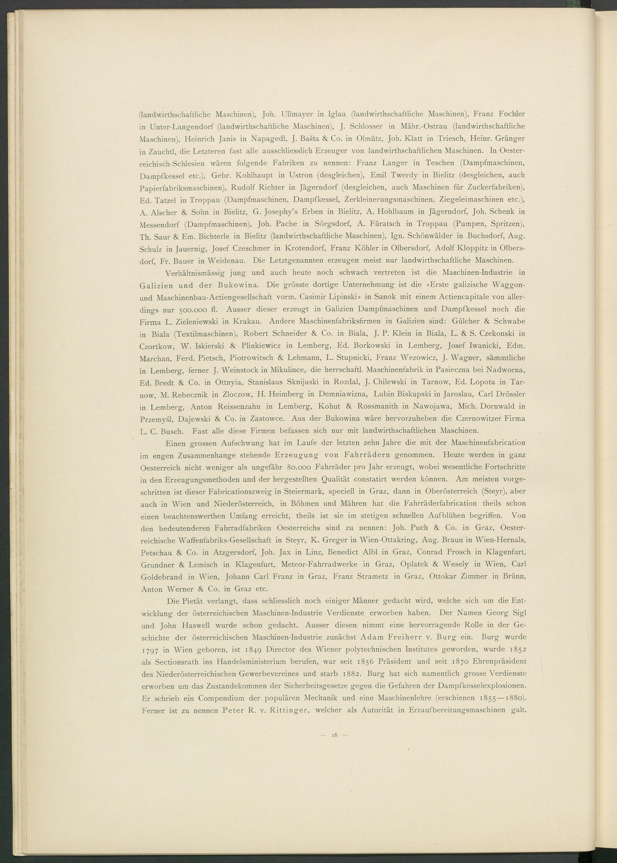 Die Pietät verlangt, dass schliesslich noch einiger Männer gedacht wird, welche sich um die Entwicklung der österreichischen Maschinen-Industrie Verdienste erworben haben. Der Namen Georg Sigl und John Haswell wurde schon gedacht. Ausser diesen nimmt eine hervorragende Rolle in der Geschichte der österreichischen Maschinen-Industrie zunächst Adam Freiherr v. Burg ein. Burg wurde 1797 in Wien geboren, ist 1849 Director des Wiener polytechnischen Institutes geworden, wurde 1852 als Sectionsrath ins Handelsministerium berufen, war seit 1856 Präsident und seit 1870 Ehrenpräsident des Niederösterreichischen Gewerbevereines und starb 1882. Burg hat sich namentlich grosse Verdienste erworben um das Zustandekommen der Sicherheitsgesetze gegen die Gefahren der Dampfkesselexplosionen. Er schrieb ein Compendium der populären Mechanik und eine Maschinenlehre (erschienen 1855 —1880). Ferner ist zu nennen Peter R. v. Rittinger, welcher als Autorität in Erzaufbereitungsmaschinen galt.