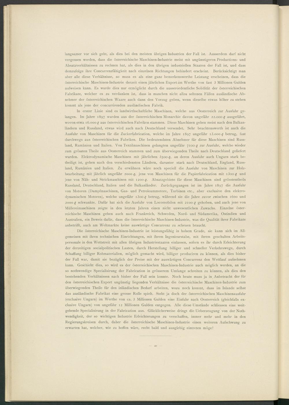 langsamer vor sich geht, als dies bei den meisten übrigen Industrien der Fall ist. Ausserdem darf nicht vergessen werden, dass die österreichische Maschinen-Industrie meist mit ungünstigeren Productions- und Absatzverhältnissen zu rechnen hat, als dies in den übrigen industriellen Staaten der Fall ist, und dass demzufolge ihre Concurrenzfähigkeit nach einzelnen Richtungen behindert erscheint. Berücksichtigt man aber alle diese Verhältnisse, so muss es als eine ganz bemerkenswerthe Leistung erscheinen, dass die österreichische Maschinen-Industrie derzeit einen jährlichen Export im Werthe von fast 3 Millionen Gulden aufweisen kann. Es wurde dies nur ermöglicht durch die ausserordentliche Solidität der österreichischen Fabrikate, welcher es zu verdanken ist, dass in manchen nicht allzu seltenen Fällen ausländische Abnehmer der österreichischen Waare auch dann den Vorzug geben, wenn dieselbe etw r as höher zu stehen kommt als jene der concurrirenden ausländischen Fabrik.
