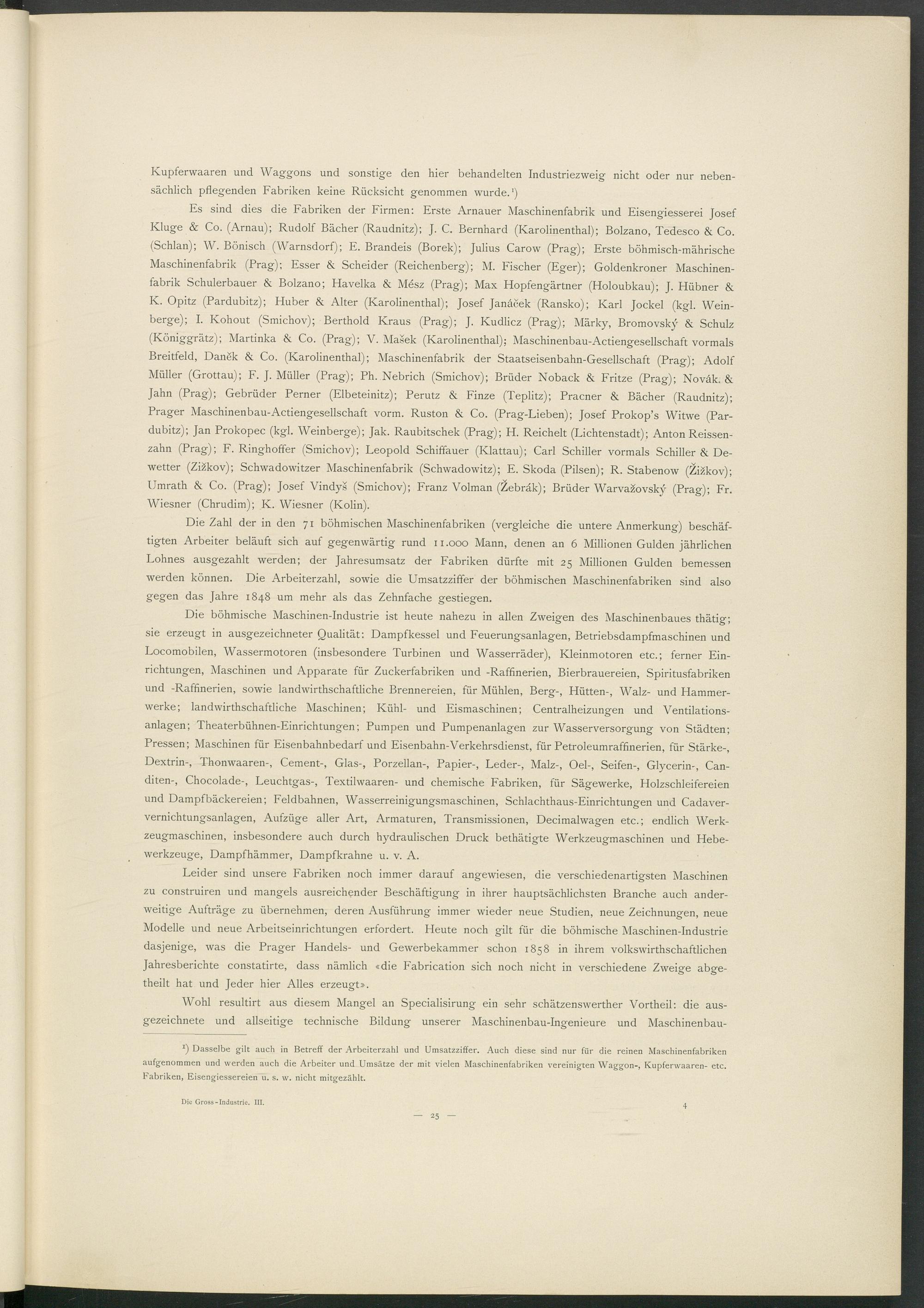 Es sind dies die Fabriken der Firmen: Erste Arnauer Maschinenfabrik und Eisengiesserei Josef Kluge & Co. (Arnau); Rudolf Bacher (Raudnitz); J. C. Bernhard (Karolinenthal); Bolzano, Tedesco & Co. (Schlan); W. Bönisch (Warnsdorf); E. Brandeis (Borek); Julius Carow (Prag); Erste böhmisch-mährische Maschinenfabrik (Prag); Esser & Scheider (Reichenberg); M. Fischer (Eger); Goldenkroner Maschinenfabrik Schulerbauer & Bolzano; Havelka & Mösz (Prag); Max Hopfengärtner (Holoubkau); J. Hübner & K. Opitz (Pardubitz); Huber & Alter (Karolinenthal); Josef Janäcek (Ransko); Karl Jockel (kgl. Weinberge); I. Kohout (Smichov); Berthold Kraus (Prag); J. Kudlicz (Prag); Märky, Bromovsky & Schulz (Königgrätz); Martinka & Co. (Prag); V. Masek (Karolinenthal); Maschinenbau-Actiengesellschaft vormals Breitfeld, Dan&k & Co. (Karolinenthal); Maschinenfabrik der Staatseisenbahn-Gesellschaft (Prag); Adolf Müller (Grottau); F. J. Müller (Prag); Ph. Nebrich (Smichov); Brüder Noback & Fritze (Prag); Noväk. & Jahn (Prag); Gebrüder Perner (Elbeteinitz); Perutz & Finze (Teplitz); Pracner & Bächer (Raudnitz); Prager Maschinenbau-Actiengesellschaft vorm. Ruston & Co. (Prag-Lieben); Josef Prokop’s Witwe (Pardubitz); Jan Prokopec (kgl. Weinberge); Jak. Raubitschek (Prag); H. Reichelt (Lichtenstadt); Anton Reissen- zahn (Prag); F. Ringhoffer (Smichov); Leopold Schiffauer (Klattau); Carl Schiller vormals Schiller & De- wetter (Zizkov); Schwadowitzer Maschinenfabrik (Schwadowitz); E. Skoda (Pilsen); R. Stabenow (Zizkov); Umrath & Co. (Prag); Josef Vindys (Smichov); Franz Volman (Zebräk); Brüder Warvazovsky (Prag); Fr. Wiesner (Chrudim); K. Wiesner (Kolin).