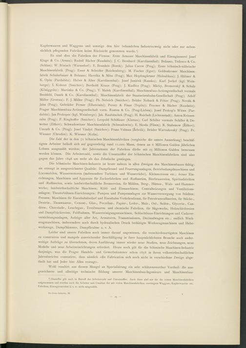 Die Zahl der in den 71 böhmischen Maschinenfabriken (vergleiche die untere Anmerkung) beschäftigten Arbeiter beläuft sich auf gegenwärtig rund 11.000 Mann, denen an 6 Millionen Gulden jährlichen Lohnes ausgezahlt werden; der Jahresumsatz der Fabriken dürfte mit 25 Millionen Gulden bemessen werden können. Die Arbeiterzahl, sowie die Umsatzziffer der böhmischen Maschinenfabriken sind also gegen das Jahre 1848 um mehr als das Zehnfache gestiegen.